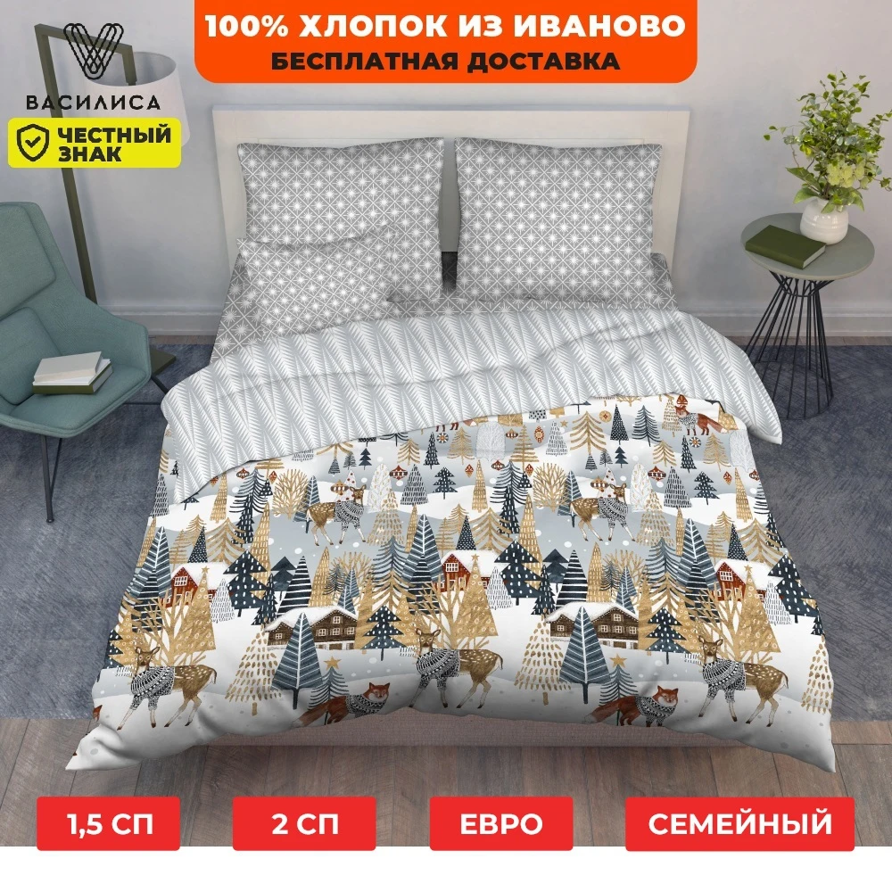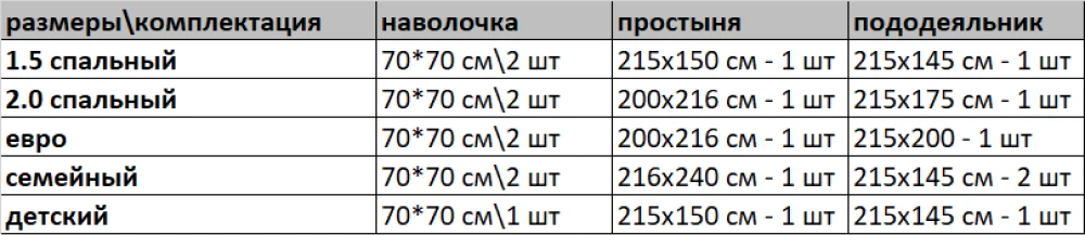 Постельное белье от бренда "Василиса", изготовлено из 100%-хлопка ткань бязь, собственного производства. Инновационная система мягчения ткани улучшает тактильные ощущения и придает совершенно бесподобную мягкость. Постельное белье выдерживает множество стирок без утраты яркости, обладает гигроскопичностью и "дышит", не электризуется, не подвержено образованию катышков. Способ застегивания наволочки - клапан, шириной 25 см, что очень комфортно, при использовании наволочка не раскрывается, пододеяльника - отверстие без застежки по краю изделия с подвернутым краем.1,5 спПростыня 214*150 ± 4 1 штПододеяльник 215*145 ± 2 1 шт.Наволочки 70*70 ± 1 2 шт2,0 спПростыня 200*216 ± 4 1 штПододеяльник 215*175 ± 2 1 шт.Наволочки 70*70 ± 1 2 штЕвроПростыня 200*216 ± 4 1 штПододеяльник 215*200 ± 2 1 шт.Наволочки 70*70 ± 1 2 штДуоПростыня 216*240 ± 4 1 штПододеяльник 215*145 ± 2 2 шт.Наволочки 70*70 ± 1 2 шт