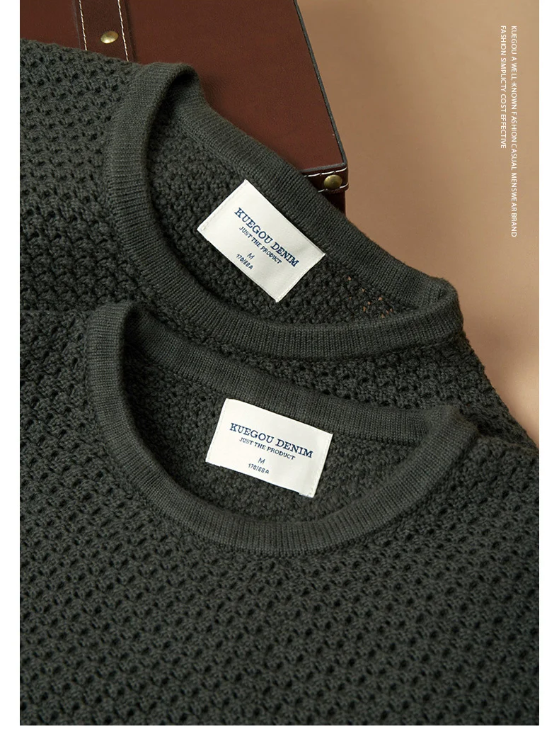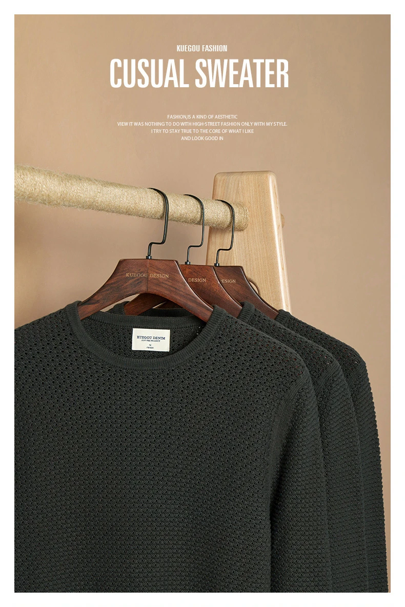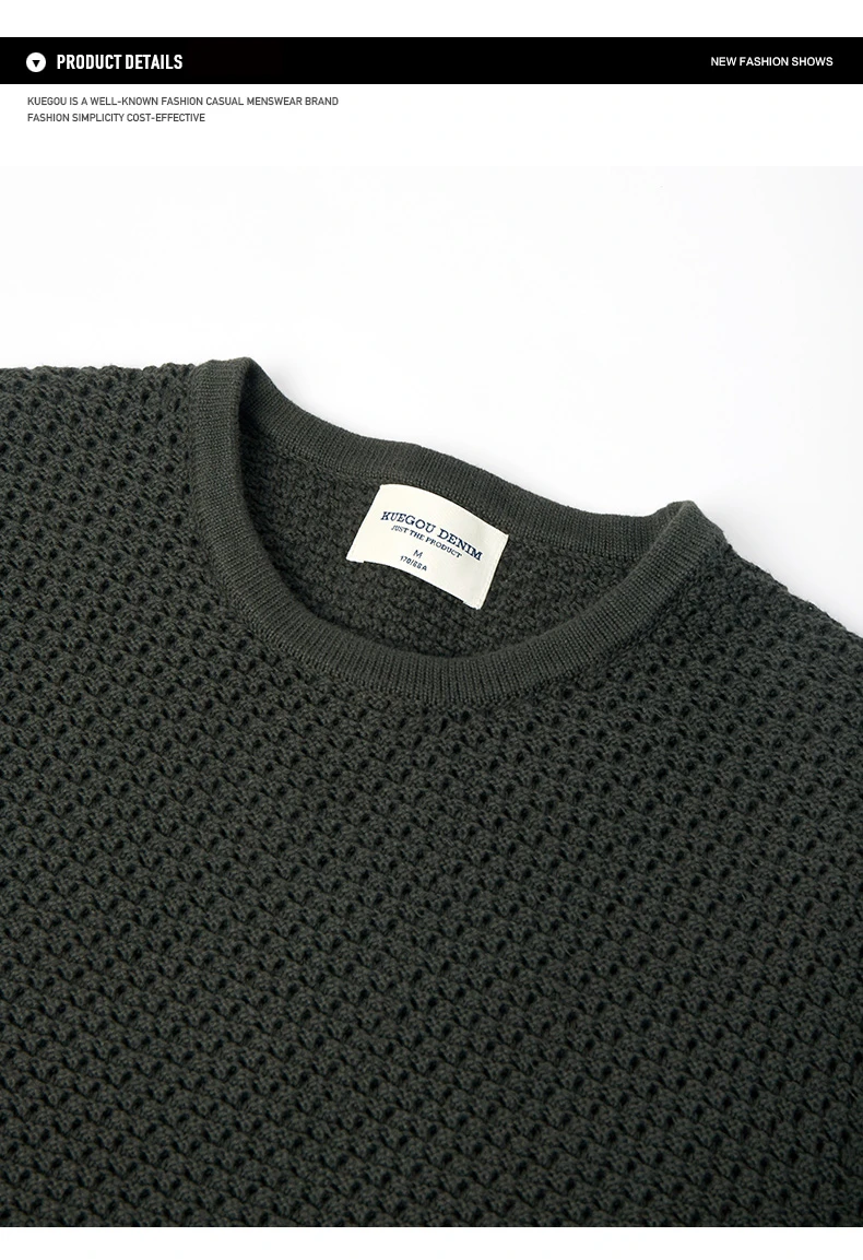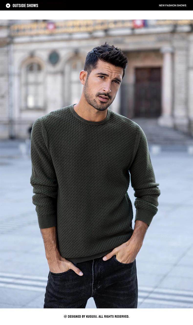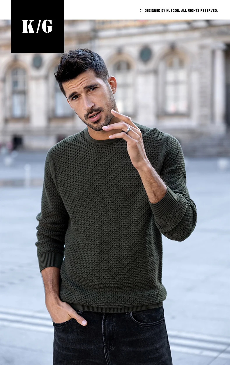 Мужской Хлопковый пуловер KUEGOU, однотонный зеленый свитер с вырезом, повседневный джемпер, брендовая вязаная одежда, осень 2021, 100%