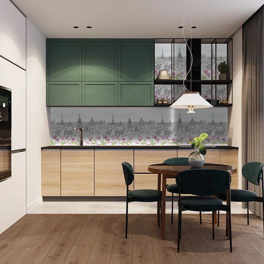 Кухонный фартук для пространства междунавесными шкафами, плитой и столешницейне просто защищает стены от влаги, копотии и загрязнений, но и придает кухневоздушность, наполняет новыми красками.