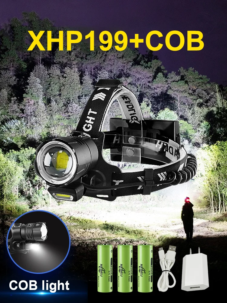 XHP199 светодиодный + COB светильник2021 Новая обновленная версия XHP199 + COB, различные прожекторы, гибкий зум и четкое видение. Совершенно новый опыт, диапазон до 800-1500 метров, супермощный аккумулятор, более длительный срок службы батареи, чем обычные 10000 мАч, реальный и свободно регулируемый 90 градусов, широкий светильник, И более концентрированный светильник. Легкая конструкция, не давит на одежду. С функцией мобильного питания, он может заряжать мобильный телефон, отображать мощность в режиме реального времени, а Уровень водонепроницаемости может достигать 8 уровней, что может легко справиться с суровой внешней средой ночью.