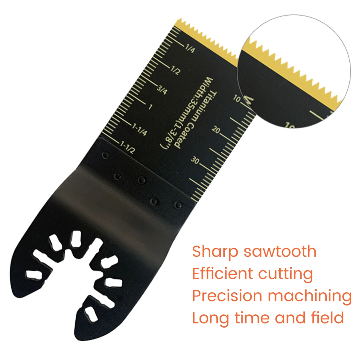 【Износостойкость 】 двухметаллическое многоинструментальное лезвие имеет зубцы с титановым покрытием, делает его особенно устойчивым к твердым металлам, таким как гвозди или болты, и может прослужить более чем в два раза дольше, чем обычные биметаллические лезвия.