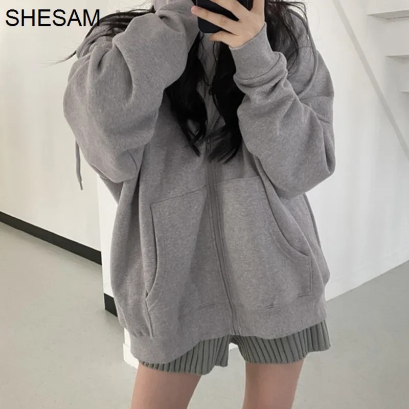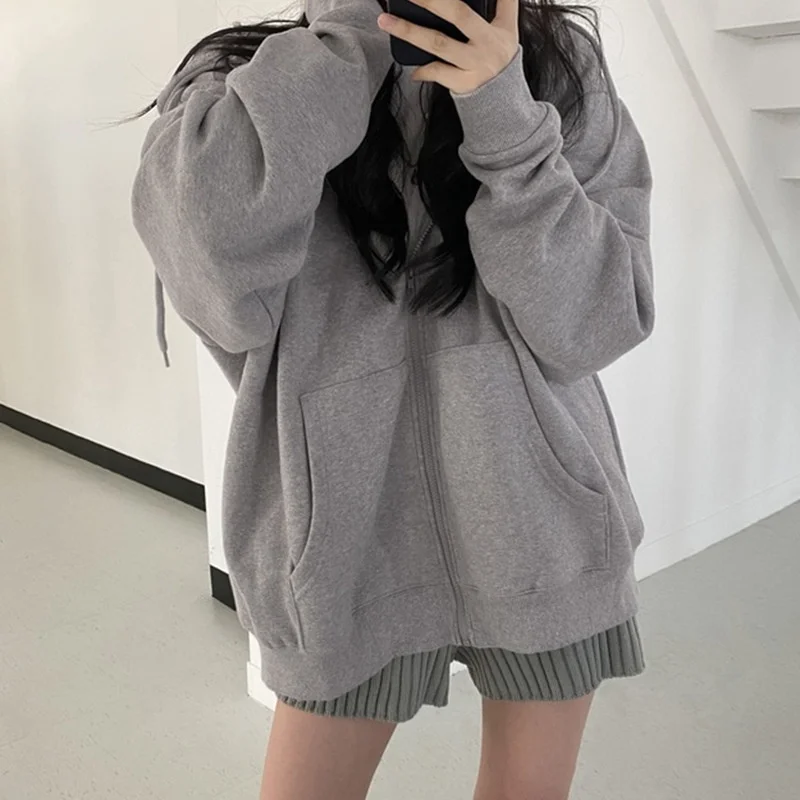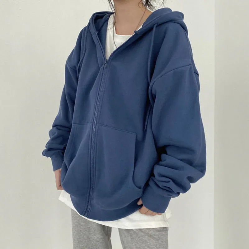 Женская однотонная толстовка на молнии, Корейская куртка с капюшоном в стиле Харадзюку большого размера, уличная Толстовка с длинным рукавом и капюшоном, 2022