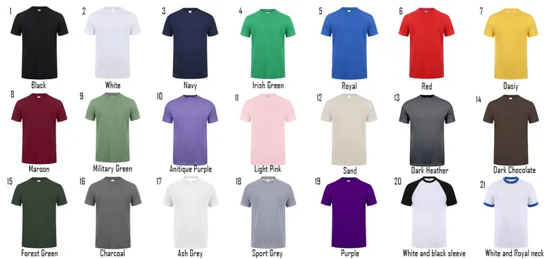 Примечание: Если вам не нравятся футболки в вариантах, пожалуйста, выберите цвет на заказ и отправьте нам сообщение с указанием цвета футболки и цвета печати. У нас есть 21 цвет футболки (как на картинке) и 4 цвета принтинга (белый, черный, красный, желтый).