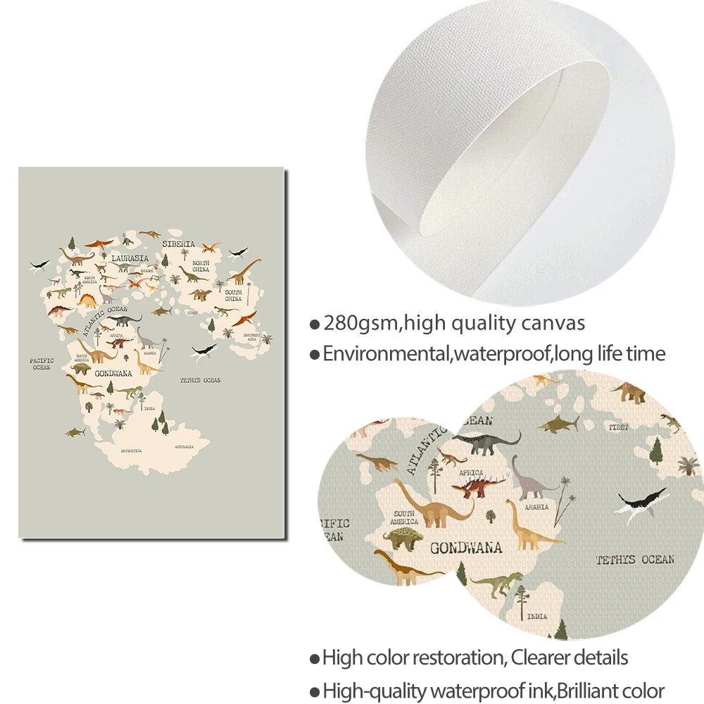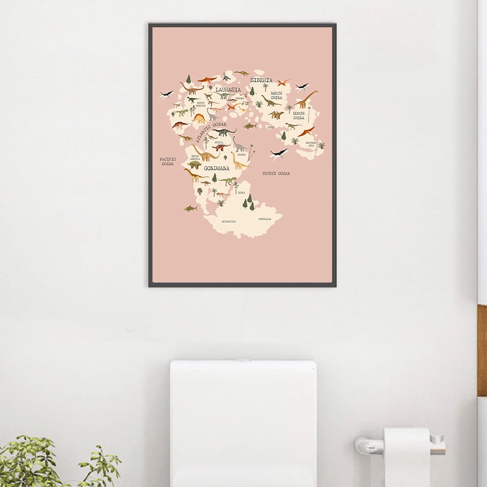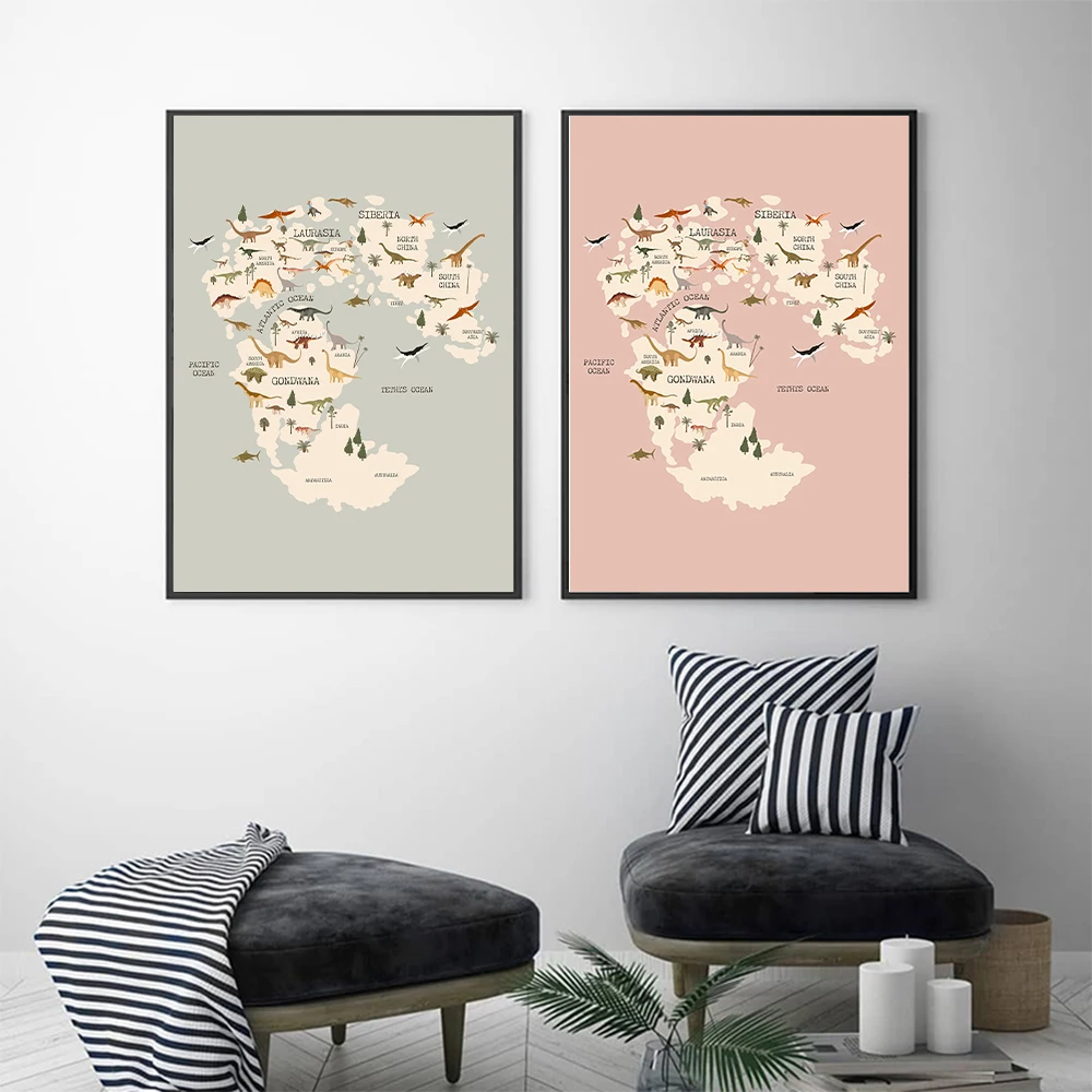 Постер в скандинавском стиле с изображением динозавра, карты мира, холст, голубой, розовый, для детской комнаты, животные, Художественная печать, Настенная картина, для гостиной, детской, спальни, домашний декор