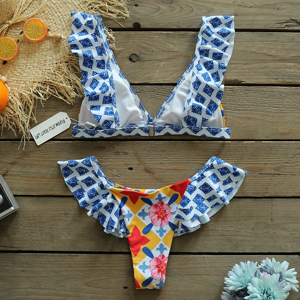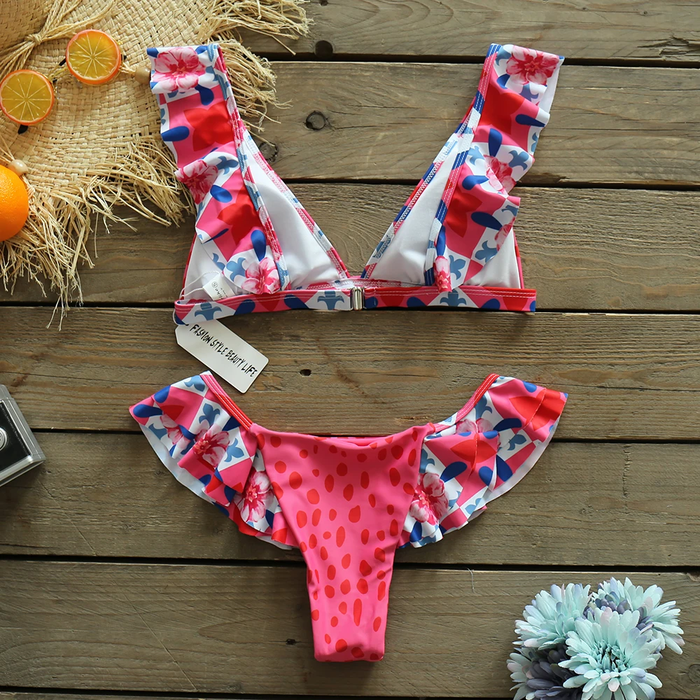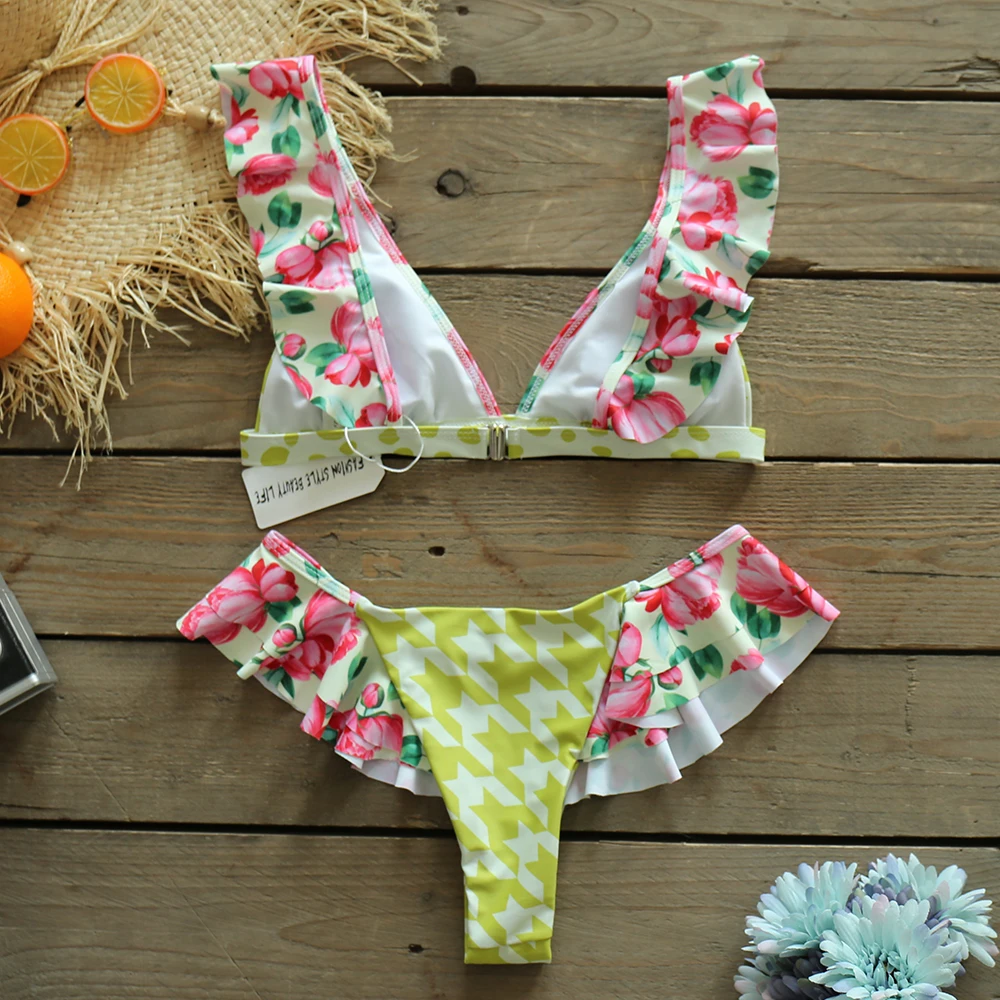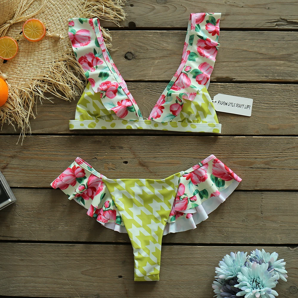 Купальник-бикини с цветочным принтом и оборками, с заниженной талией