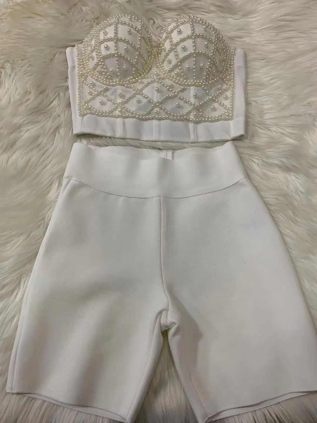 Женский винтажный комплект из двух предметов, элегантный облегающий комплект из искусственного шелка, короткий топ с бусинами и шорты с высокой талией