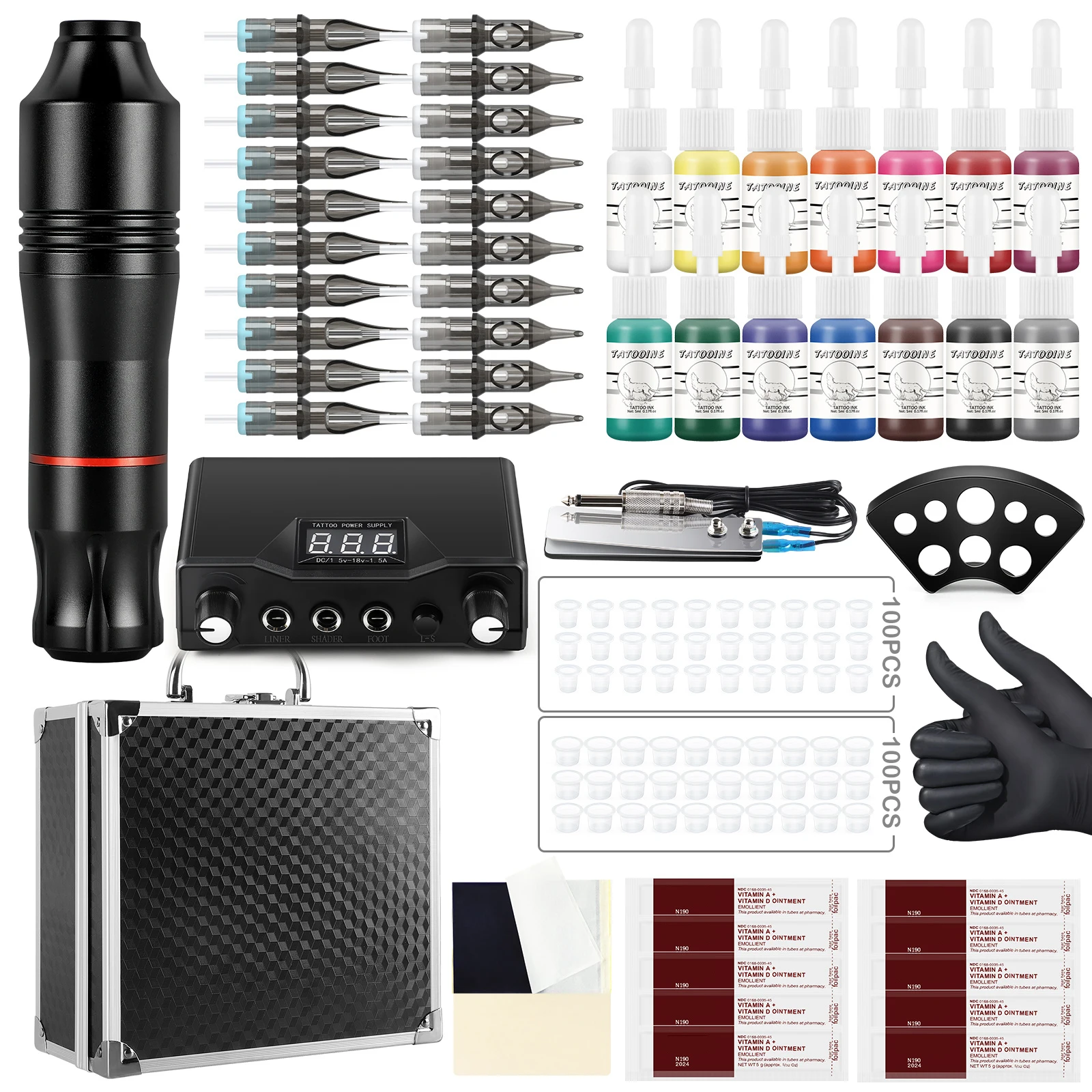 1 × мини LCD Двойной источник питания1 × кабель питания1 × педаль1 × роторная ручка тату машина1 × 14 шт тату чернила1 × 10 шт тату иглы-вкладыш (3RL, 5RL)1 × 10 шт иглы татуировки (5M1, 7M1)100 × большие чашки для тату100 × маленькие татуировки Чернила чашки1 × белая кожа для тату1 × Бумага для переноса татуировок10 × после крема2 × одноразовые перчатки1 × татуировки Чашки Чернила Держатель1 × алюминиевая коробка для тату