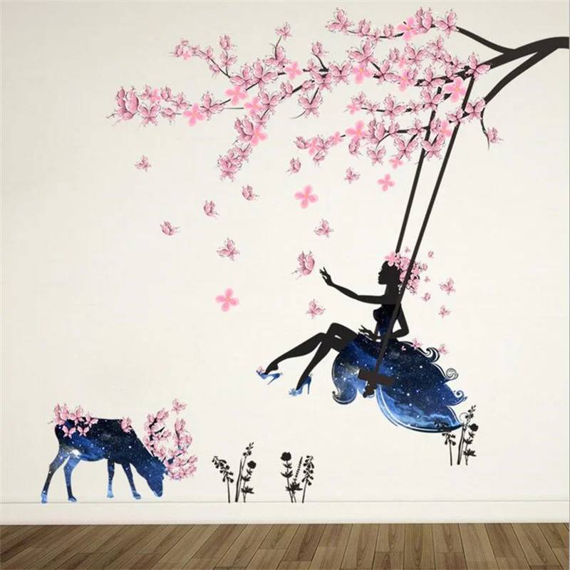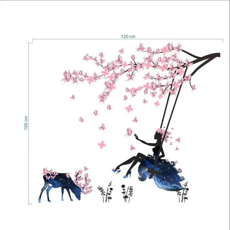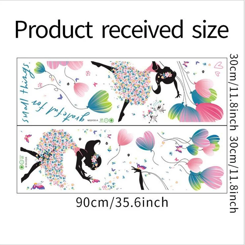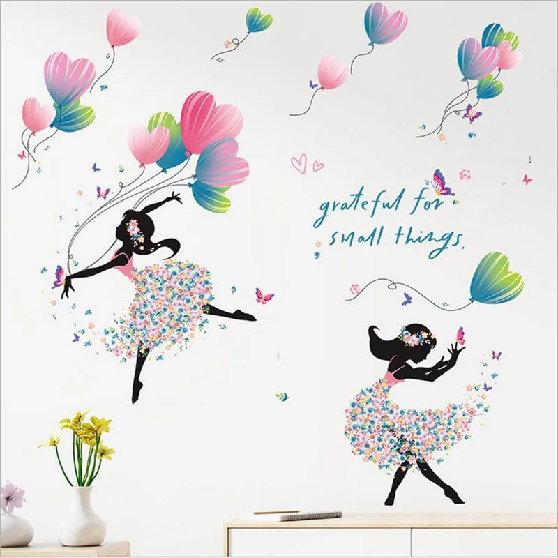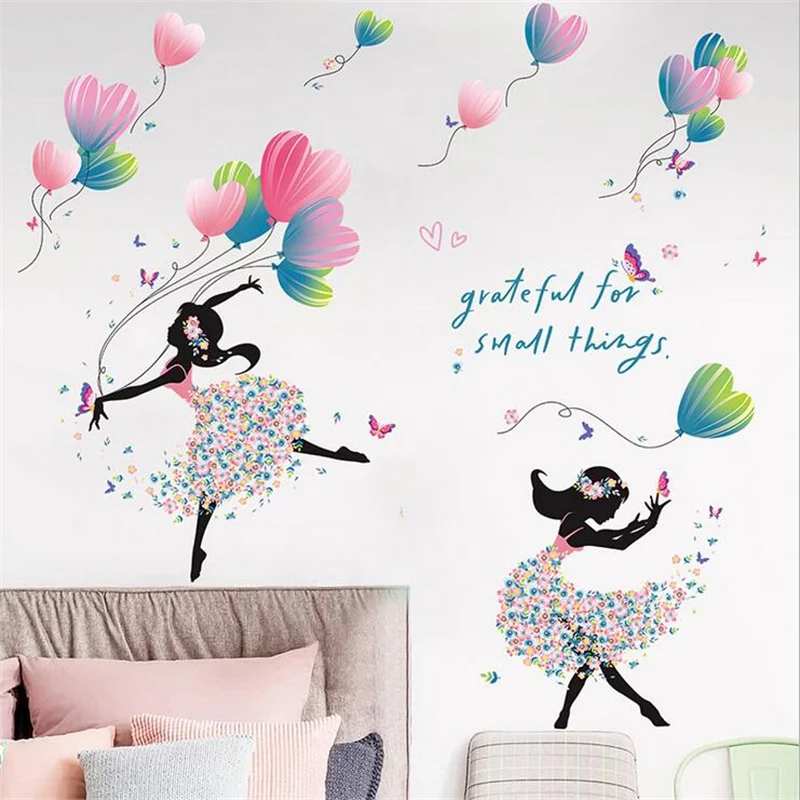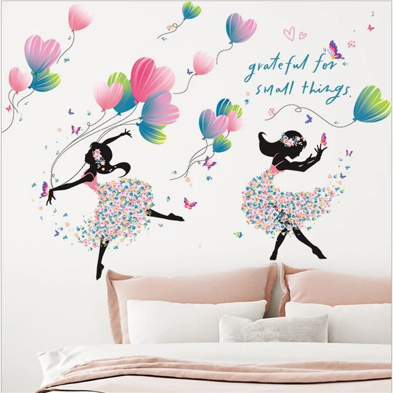 Съемные воздушные шары для танцующей девочки, цветы, бабочки, настенные наклейки для девочек, спальни, украшение для дома, самоклеящиеся обои, 2 шт.