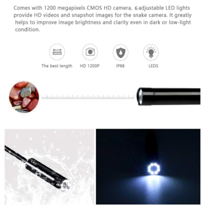 5. Пожалуйста, сначала проверьте модель вашего телефона. Эндоскоп с гибким полужестким кабелем, который может сгибаться и удерживать форму, чтобы получить доступ к широкому разнообразию узких мест, таких как изогнутые отверстия или трубы. Это имеет огромное значение для указания и позиционирования камеры для разных углов использования.