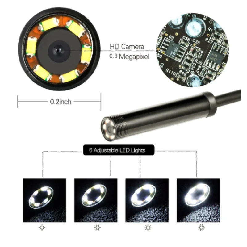 4. С 8 регулируемыми светодиодами на наконечнике камеры, это значительно помогает улучшить яркость и четкость изображения даже в условиях темного или низкого светильник, и позволяет работать намного лучше.