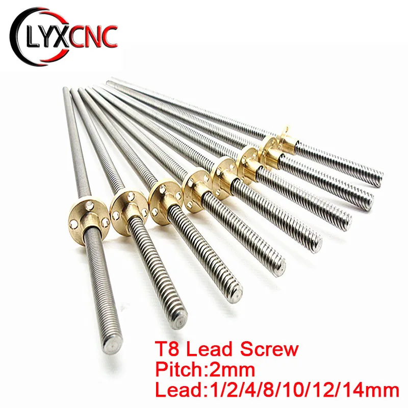 Свинцовый винт T8 1 мм2 мм4 мм8 мм12 мм14 мм шаг 2 мм OD 8 мм L 600 650 700 750 800 850 мм с гайкой для 3D-принтер с ЧПУ
