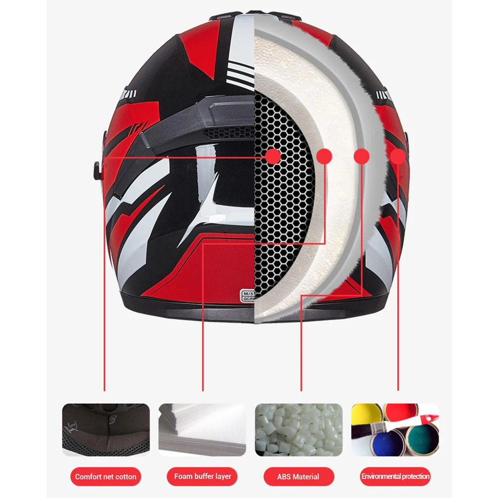 Высокопрочный корпус из АБС-пластика, легкий и ударопрочныйГладкий и легкий дизайн уменьшает шум ветраМногослойный буферный слой EPS обеспечивает современное поглощение энергии.Комфортная мягкая подкладка из дышащей технической ткани, гипоаллергенная, высококачественная ткань, мягкая, впитывающая, вентиляция, лучшая гибкость; Больше чистотыДизайн откидных линз обеспечивает защиту от ультрафиолетаВпускные и Выхлопные порты обеспечивают большую вентиляцию, чтобы держать вас в прохладеБЫСТРОРАЗЪЕМНАЯ Пряжка для надежной фиксации, которая останется на вашей головеЕвропейский дизайн, передний Носок, верх и хвост, делают шлем более моднымРазумный Дизайн: подарите вам удовольствие от поездки