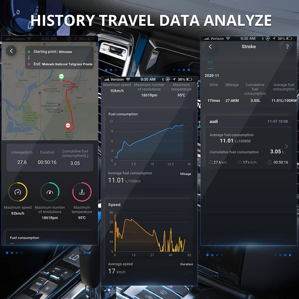 * Отображение производительности автомобиля в режиме реального времени, например, импульса, скорости транспортного средства, давления масла, температуры охлаждающей жидкости, нагрузки двигателя, давления впускного коллектора, положения дроссельной заслонки, значений оксигендатчиков, температуры воздухозаборника, И многое другое.