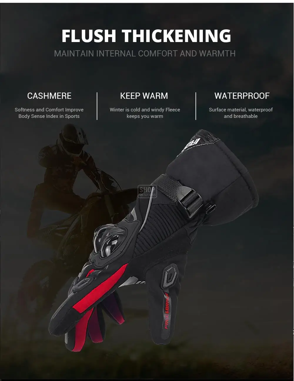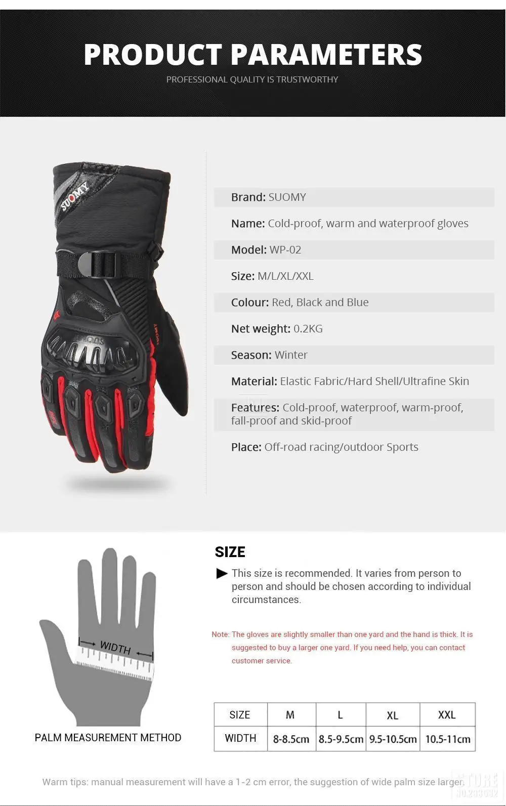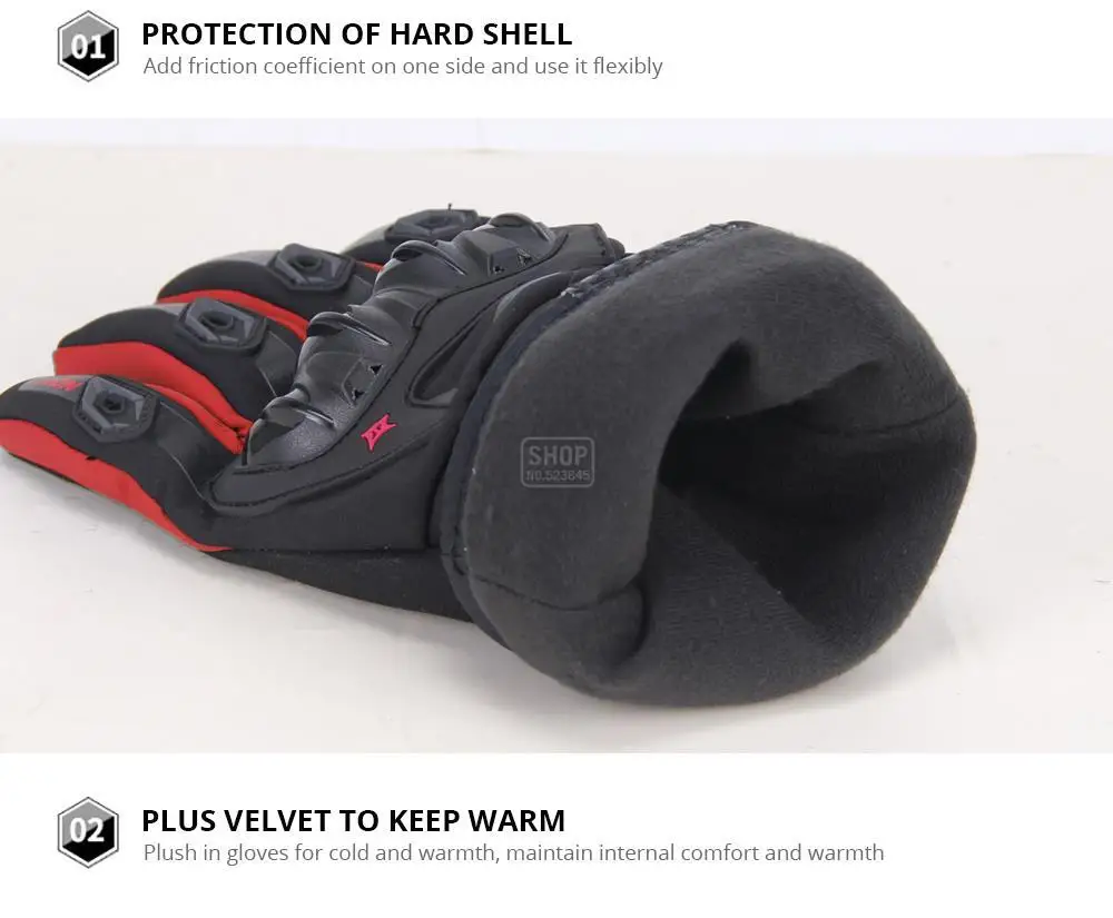 Особенности:100% полная защита: жесткая пластиковая защита суставов, Силиконовая защита пальцев и Многослойный материал ладони, защищает руки от ударов и повреждений при истиранииПлотно прилегающий и приятный захват: защитные перчатки очень хороши и плотно прилегают, как только вы их наденете, не имеют дополнительного объема в кончиках пальцев или на ладони. Противоскользящий резиновый материал в ладони обеспечивает хорошее сцепление без сжигания мышц рук, хорошо подходит для длительного вожденияТеплые и ветрозащитные: подкладка с мягким сенсорным слоем, длинные манжеты с защитой от ветра, регулируемый затягивающийся пояс на запястье, держите руки в тепле во время быстрой езды в Зимние холодные дниВодонепроницаемость: Эти перчатки для рук на мотоцикле являются водонепроницаемыми, не проблема в езде в течение нескольких часов под нормальным дождем или даже одного часа под сильным дождем, Всегда держите руки сухими и теплыми в холодную дождливую погодуФункция сенсорного экрана: Встроенный специальный материал на указательном пальце, позволяет использовать ваш мобильный телефон, не нужно снимать перчатки в холодные дни