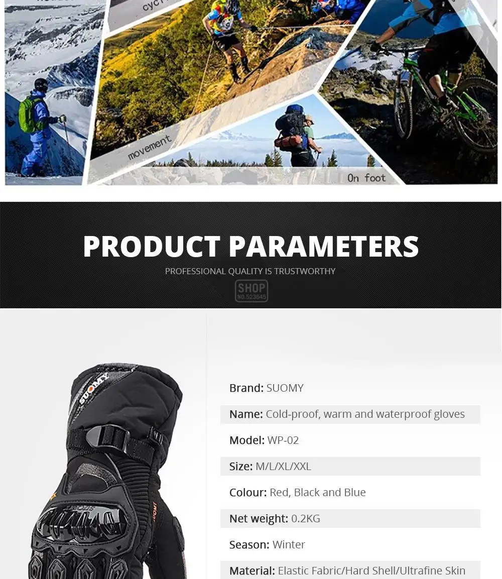 Спецификация:Название: морозостойкие и теплые водонепроницаемые перчаткиМатериал: эластичная ткань, Жесткий Чехол, кожа из микрофибрыОсобенности: морозостойкие, водонепроницаемые, теплые, противоскользящиеПрименимое место: Внедорожные гонки, Спорт на открытом воздухеЦвет: красный, черный, синийРазмер: M, L, XL, XXL