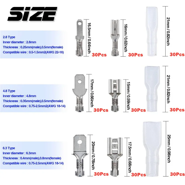 90 x клеммы для женских лопаток 90 x штыревых наконечников 90 x изоляционный рукав