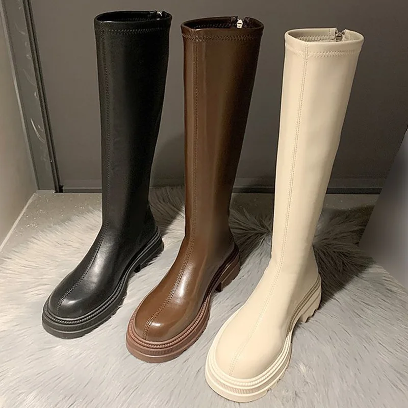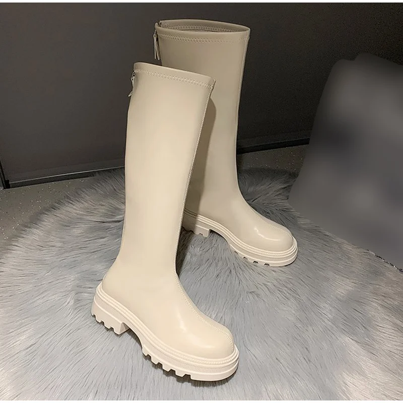 Женские сапоги до колена; Женская кожаная обувь на молнии с мехом; Зимние высокие сапоги; Обувь на платформе; Женские модные мотоциклетные сапоги; Новинка