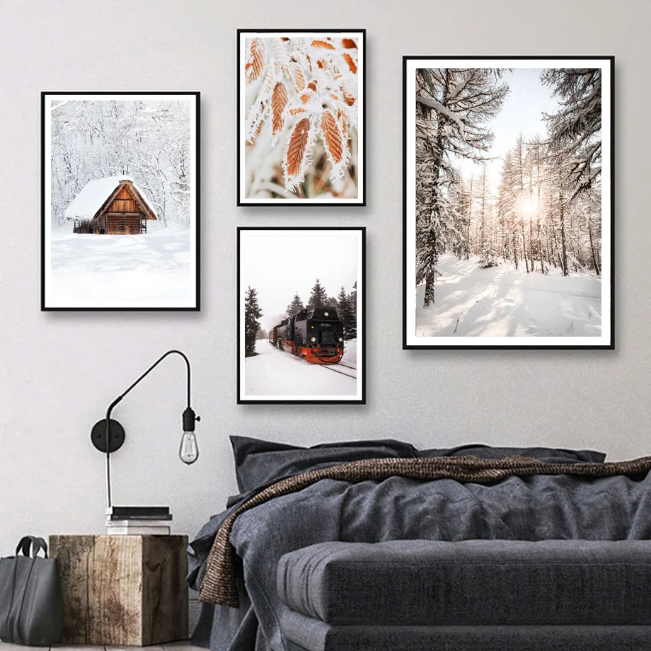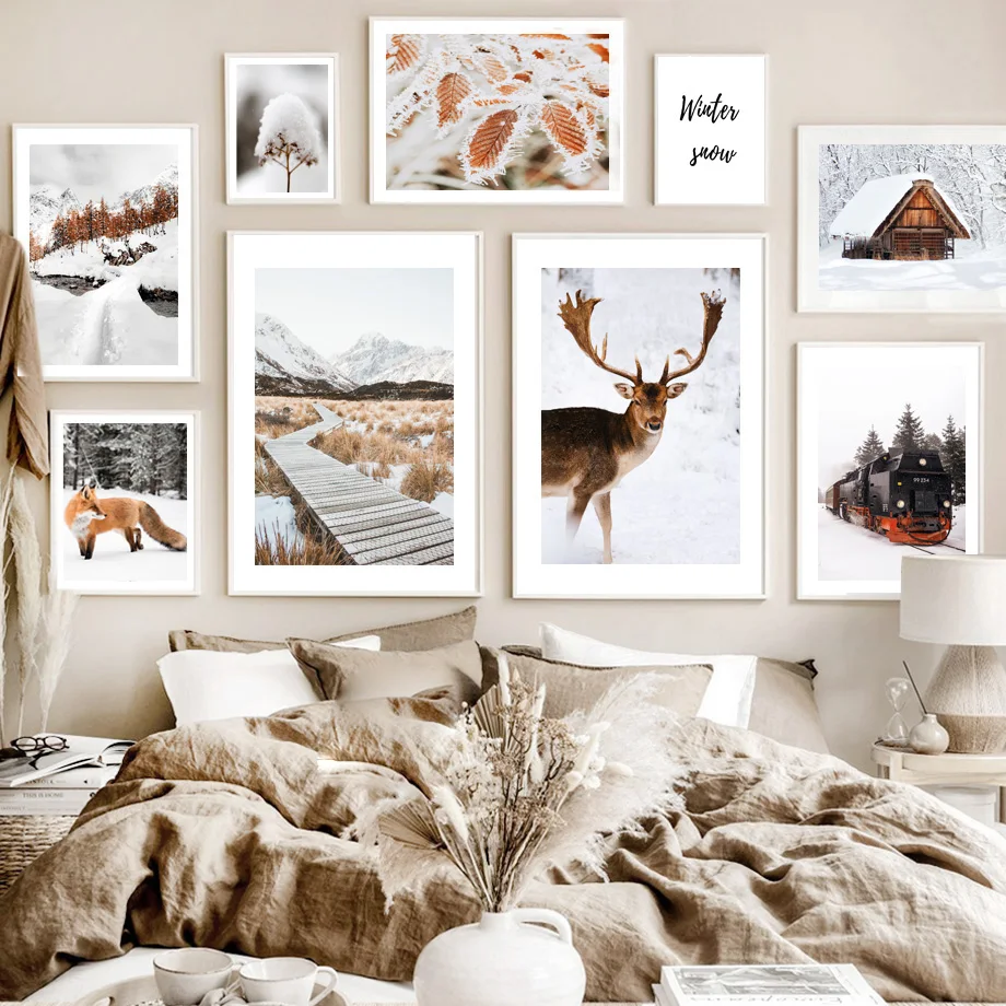 Зимняя снежная сцена настенная Картина на холсте лиса тростник белка горная фотография гостиной Рождество декор комнаты