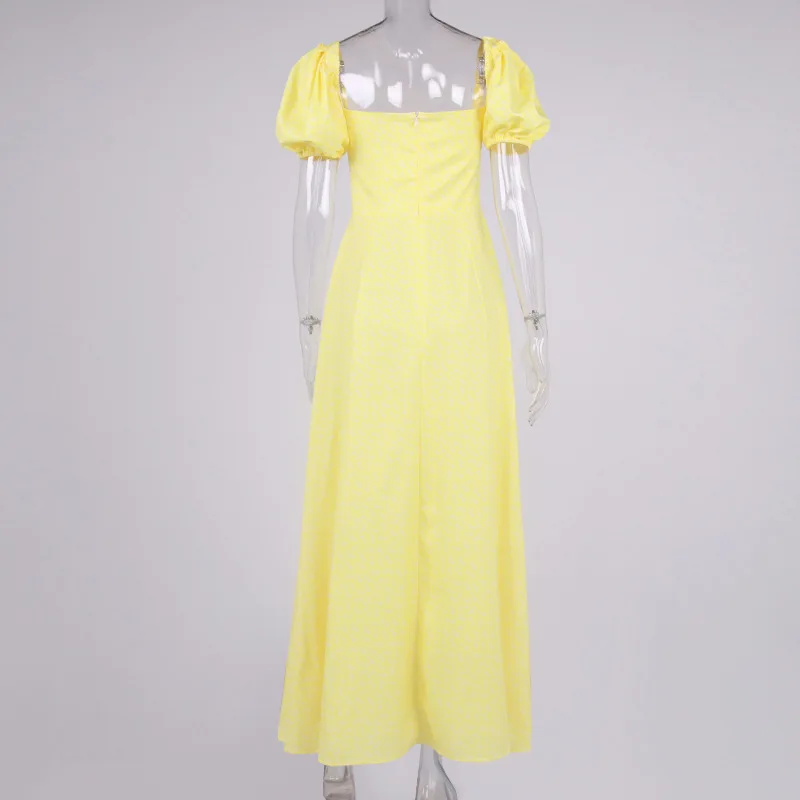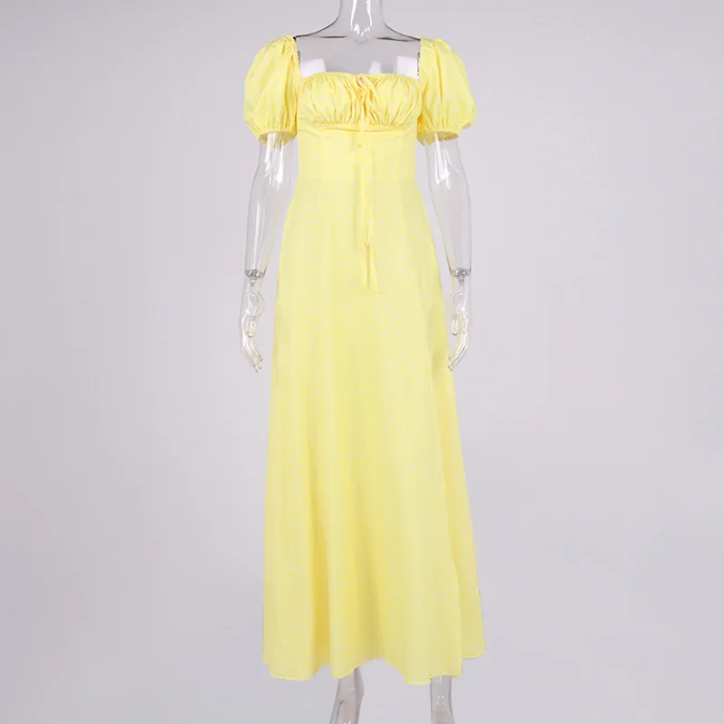 Женское платье макси с пышными рукавами, высоким разрезом и рюшами