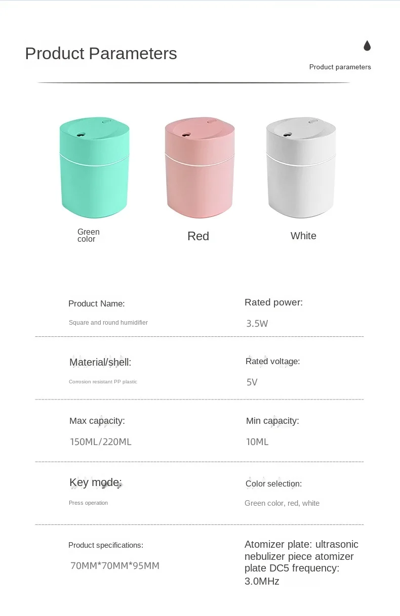 220 мл увлажнитель воздуха Эфирное масло Арома диффузор светодиодный светильник ультразвуковые увлажнители ароматерапия диффузор для домашнего офиса тихийБренд: ZAIWANМодель: ZAIWAN-K5Применимая площадь: 10-20 квадратных метровЕмкость резервуара для воды: 1 л или меньшеПрименимый Предмет: домашнийФункция: ультразвуковойКоличество выходов тумана: 1Режим работы: механическийФункция синхронизации: нет времениРежим питания: USBФорма: квадратнаяШум: 36 дБ или менееНоминальное напряжение: 5 В (в)Номинальная мощность: 1 (Вт)Технология оболочки: ABSМатериал: пластик