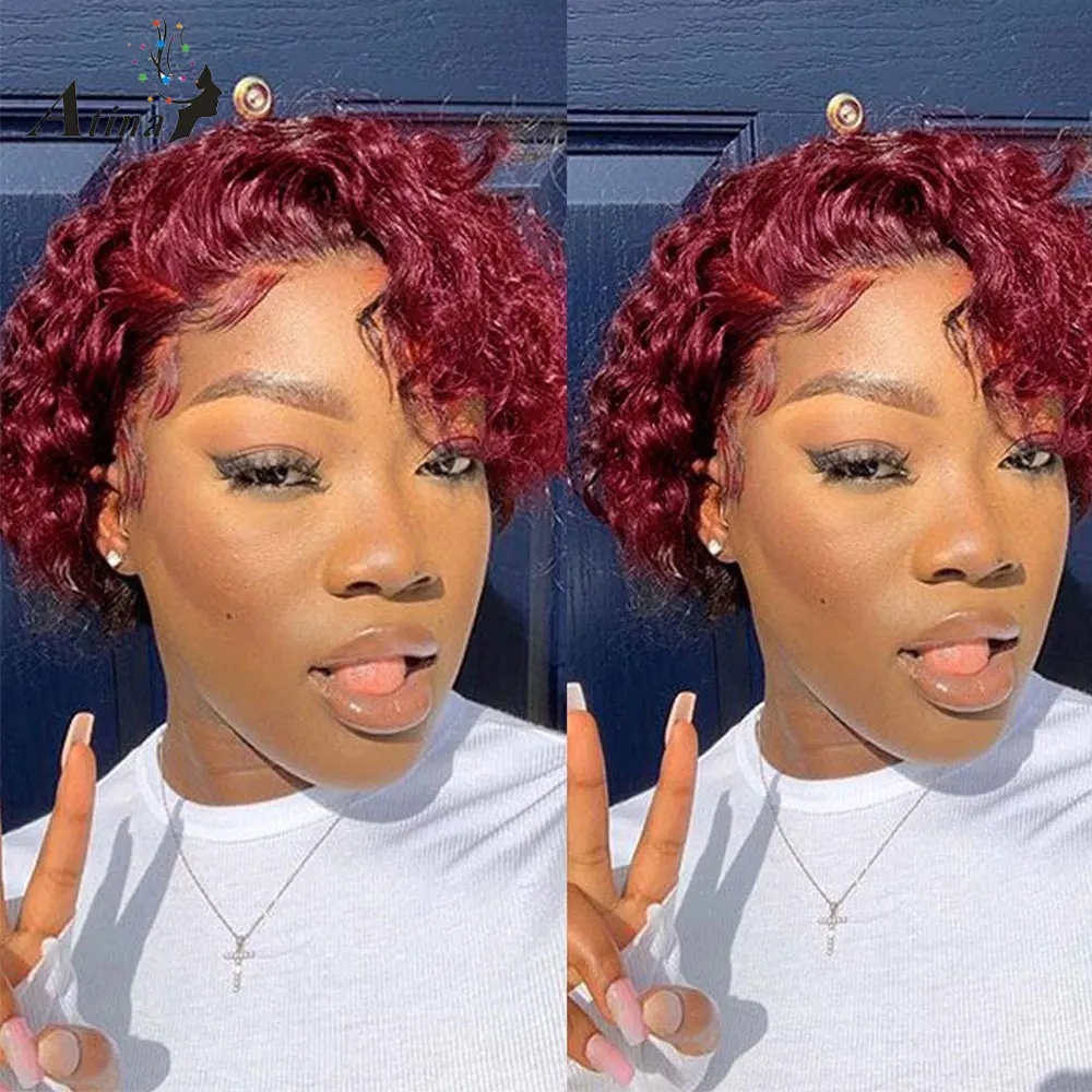 Парик Омбре 99J с перерезанными волосами черного цвета, Короткие вьющиеся парики из человеческих волос, выделитель 13X1, прозрачный парик на сетке для женщин, дешевый парик из человеческих волос