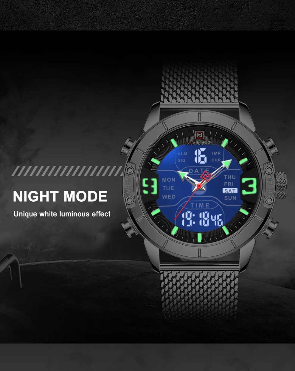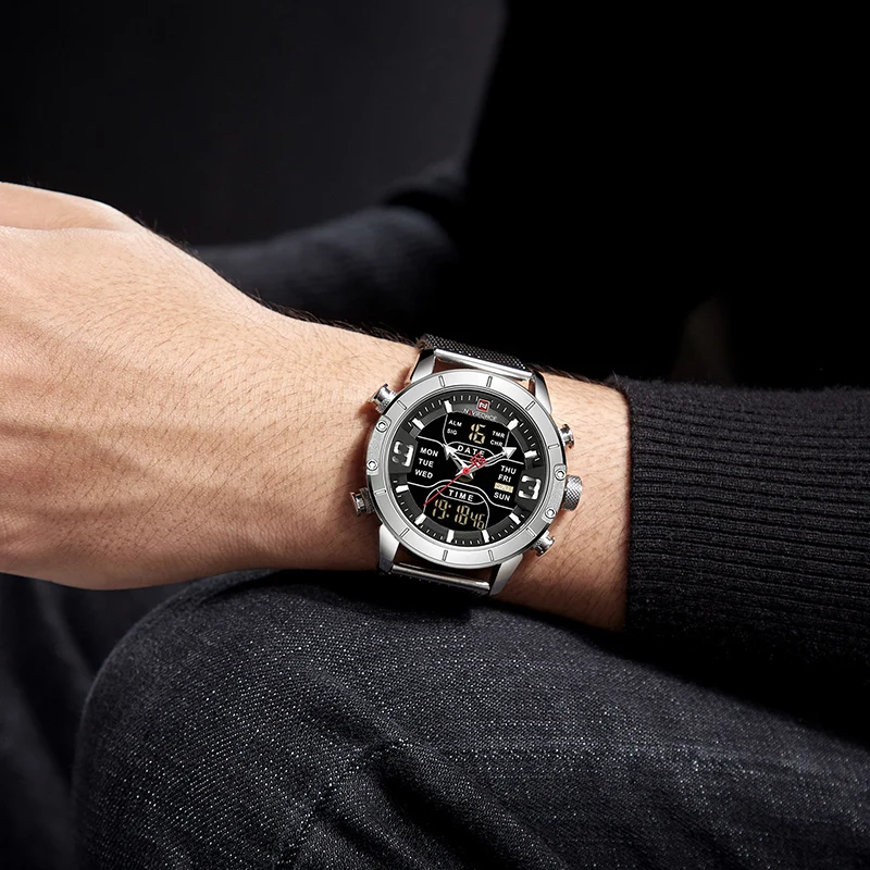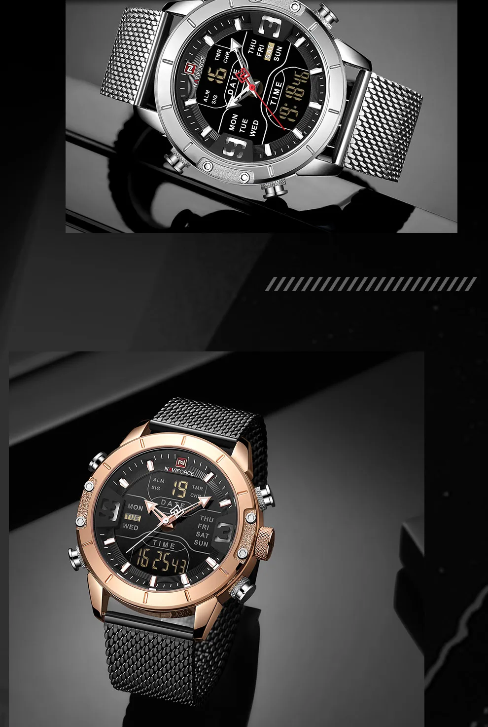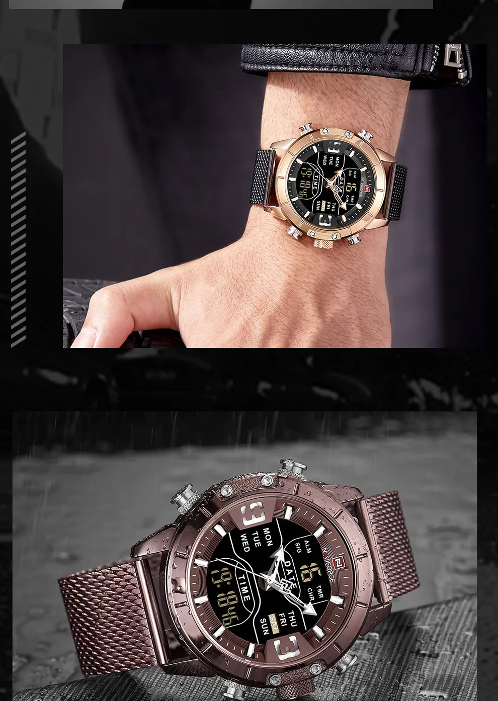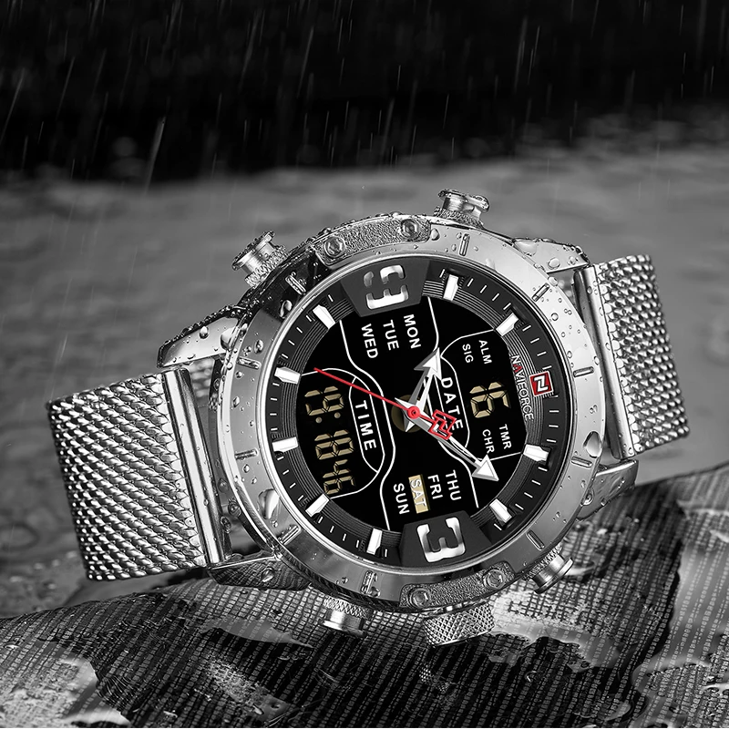 Часы наручные NAVIFORCE Мужские кварцевые, модные деловые цифровые аналоговые водонепроницаемые, из нержавеющей стали
