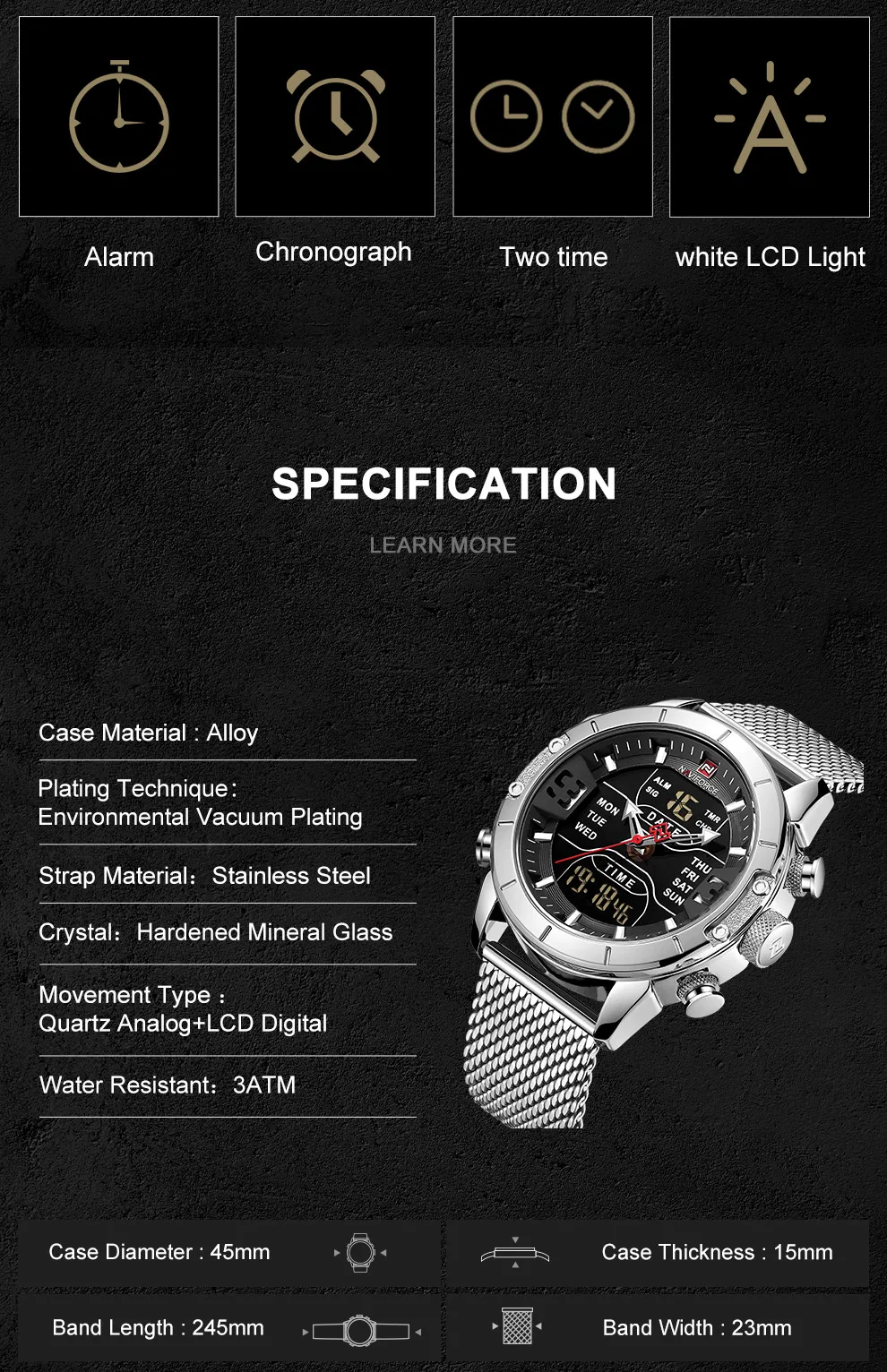 Механизм: кварцевый механизм + светодиодный дисплейПол: мужчин и женщинСтиль: Модный, Повседневный, СпортивныйМатериал циферблата: закалённое минеральное стеклоМатериал ремешка: ремешок из нержавеющей сталиТип застежки: складная застежка надежноДиаметр циферблата: 45 ммЧехол Толщина: 15 ммОбщая длина: 245 ммШирина ремешка: 23 ммВес изделия: 159 гХарактеристики: Водонепроницаемость до 30 м, отображение дня и даты, светящийся, хронограф, обратный отсчет, будильник