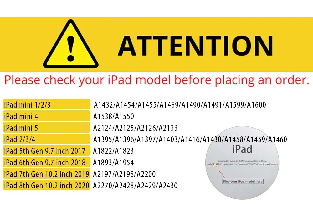 [Характеристики]: легкий, компактный, легко носить с собой и обрабатывать.Внимание: Подходящие модели:Apple ipad Mini 1 2 3 4 5/ipad 2 3 4/ipad 2017 2018 2019 2020 5th 6th 7th 8th.Пожалуйста, проверьте модель планшета перед покупкой, чтобы избежать ошибок при покупке.Если у вас есть какие-либо вопросы, пожалуйста, не подавайте спор сначала или не оставляйте негативные отзывы. Пожалуйста, свяжитесь с нами, мы предоставим вам удовлетворительное решение!