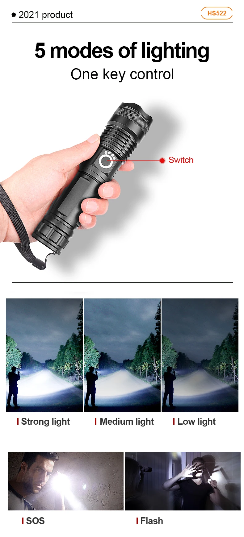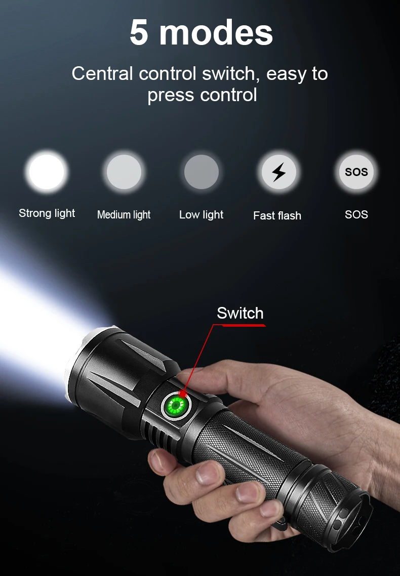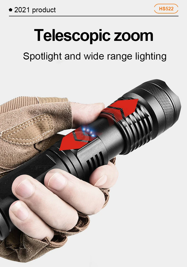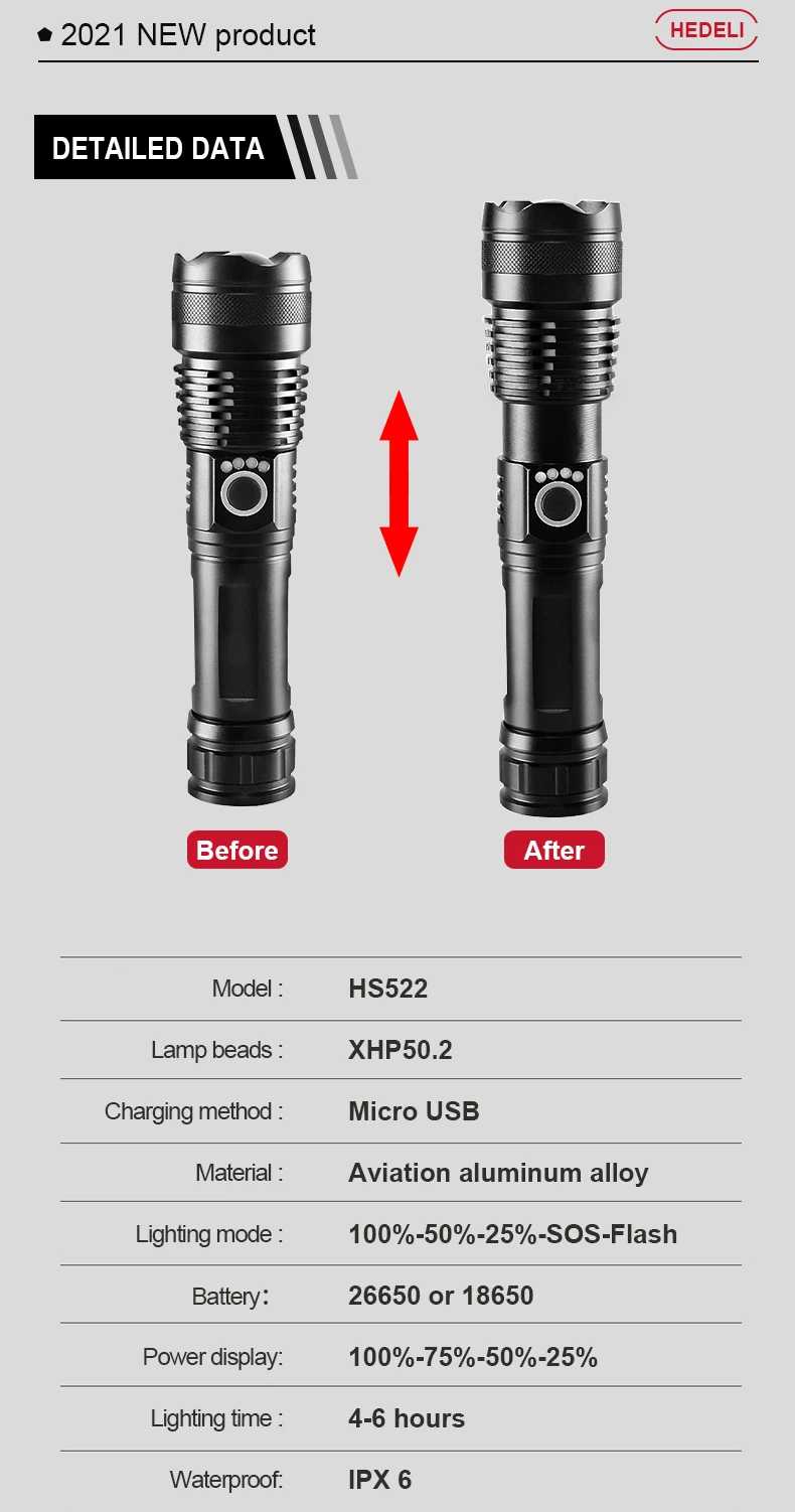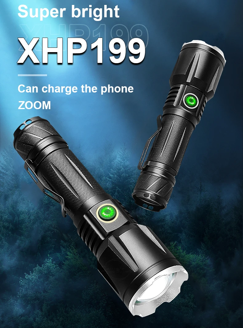 XHP199 Параметры продукта• Материал: T6063-T6 авиационный алюминий• Цвет корпуса: черный• Товар Размеры: 17*4,8*3,5 см• Вес изделия: 224 г• Модель светодиодный бусины: 16-core XHP199• 5 режимов: High - Medium - Low - SOS - Flash, Длительное нажатие на любую передачу, чтобы выключить непосредственно• Метод зарядки: быстрая зарядка типа C• Тип батареи: 18650A или 26650A• Время освещения: аккумулятор 18650 4-8 часов; Аккумулятор 26650: 8-15 часов• Расстояние освещения: 1500 м• Режим масштабирования: телескопический зум• Уровень водонепроницаемости: IPX6• Тип фонарика: семья, охота, патрулирование, ходьба, техническое обслуживание, работа, поиск и спасение и т. Д.