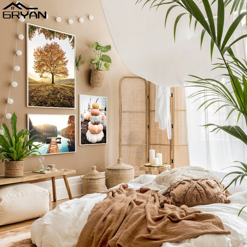 Осенний пейзаж страны озеро дерево Животные Олень Лес Холст принты и постеры Тыква тростник живопись гостиная Картина декор