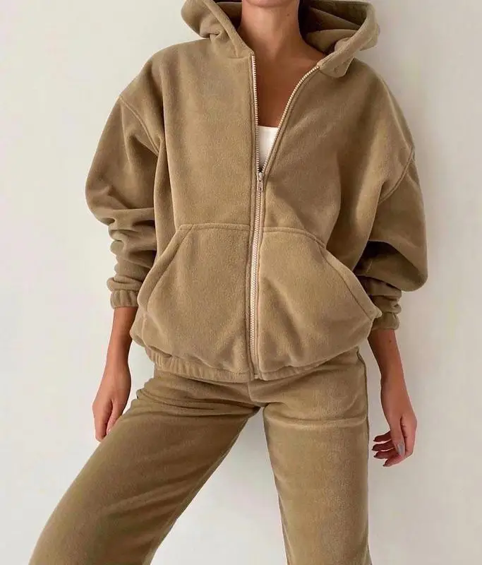 Повседневный Женский комплект из двух предметов с флисовой толстовкой, верхняя одежда на молнии с капюшоном и брюки-султанки, осенне-зимний модный уличный спортивный костюм
