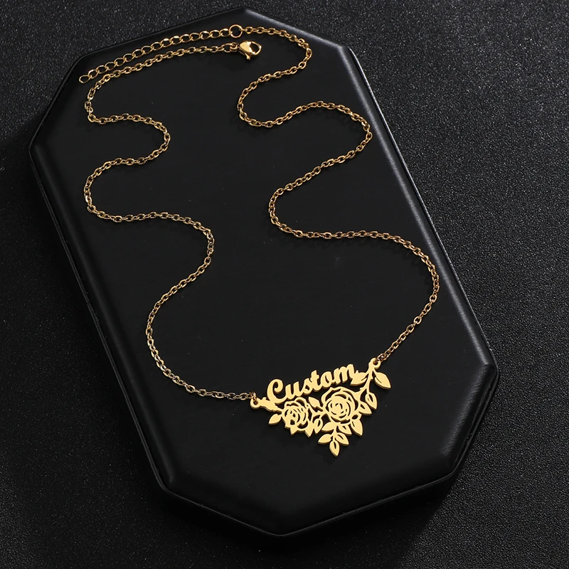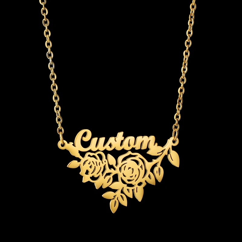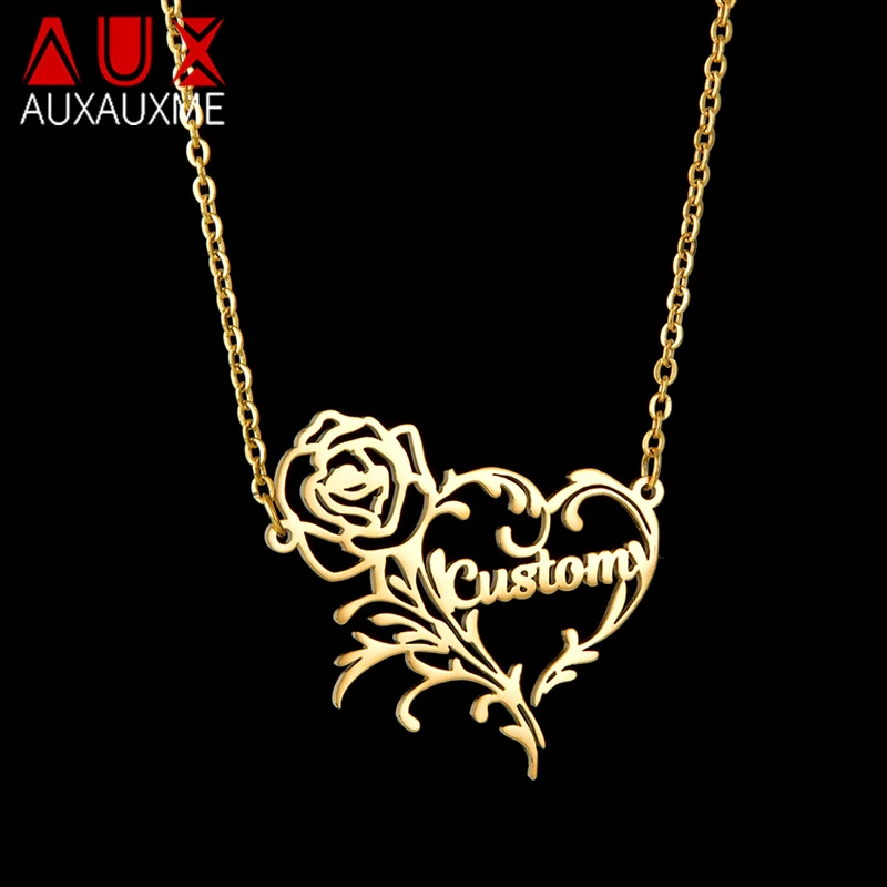 Auxauxme на заказ роза цветок сердце Имя ожерелье из нержавеющей стали для женщин Персонализированные именные таблички Свадебная вечеринка Ювелирные изделия Подарки