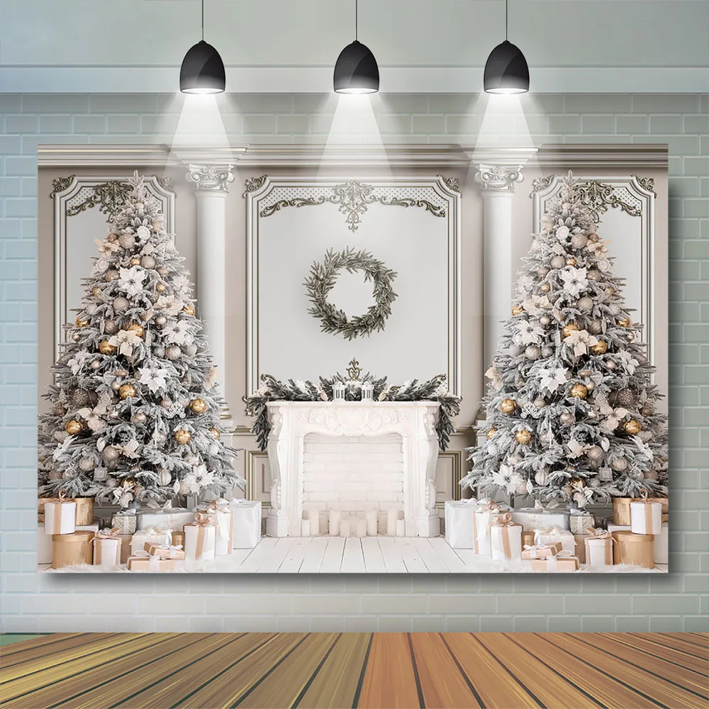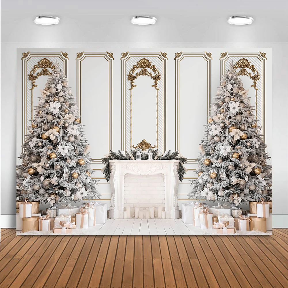 Рождественский фон для детской фотосессии серебряные деревья Золотая Подарочная коробка реквизит для детской фотостудии БЕЛЫЙ камин декорация фона