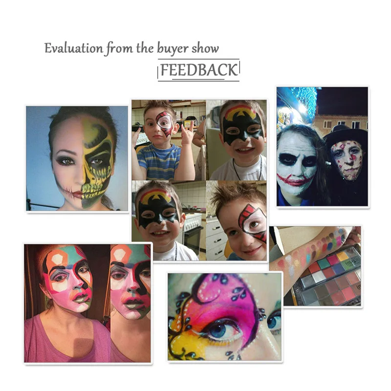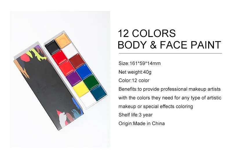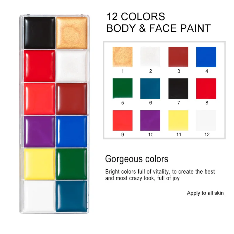 Эти краски сертифицированы Нетоксично и не содержат вредных химических веществ. Это надежно крепится на наносить на вашей коже20 ярких цветов и 2 мерцающих оттенкаПодходит для любого типа художественного макияжа или окраски спецэффектов.Цвета могут быть легко затенены вместе, чтобы получить широкий спектр эффектов.Лучше всего для создания сумасшедшего образа! Такие как веселые тематические вечерние, Необычные платья, Хэллоуин, карнавалы, фиеста;Это вид картины на масляной основе, а не на водной основе.