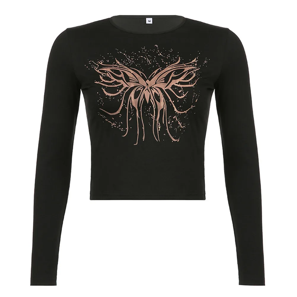 Тонкие Базовые Футболки с круглым вырезом и длинными рукавами; Футболки с принтом бабочки для девочек; Kawaii Goth Graphic; Футболки из полиэстера и черного хлопка с круглым вырезом