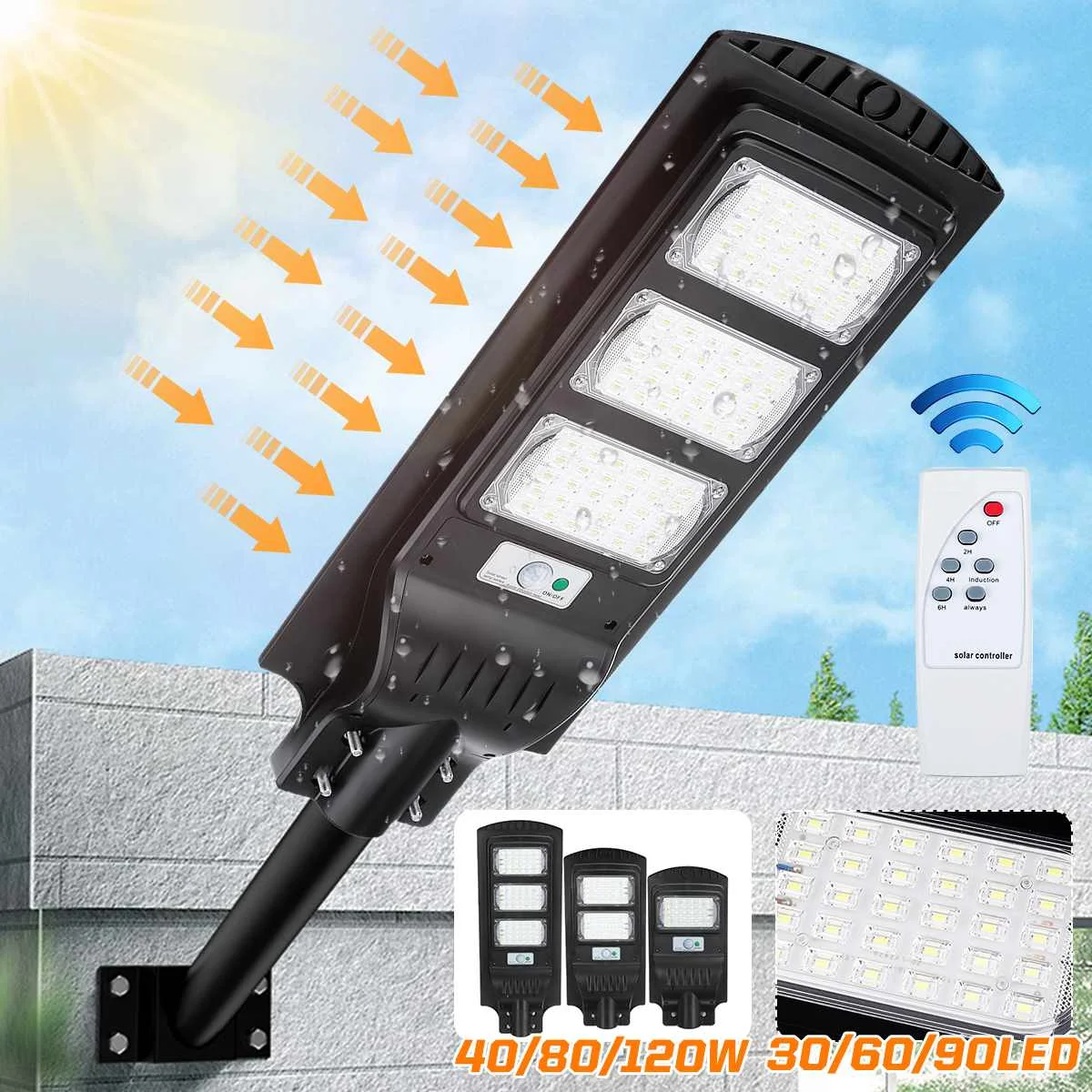Уличные светодиодные светильники на солнечной батарее, 120 Вт, 90 светодиодов, наружное охранное освещение, настенная лампа, IP67, водонепроницаемые светильники с датчиком движения и PIR, умное управление