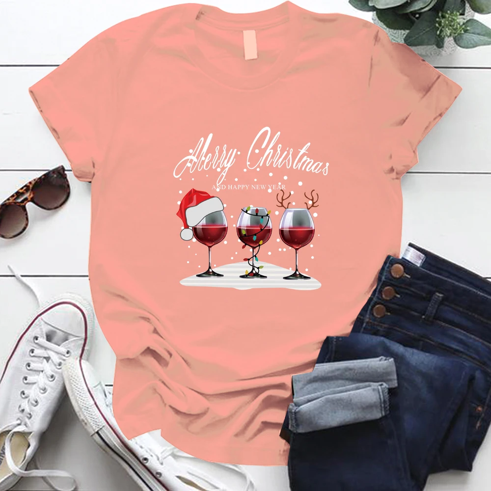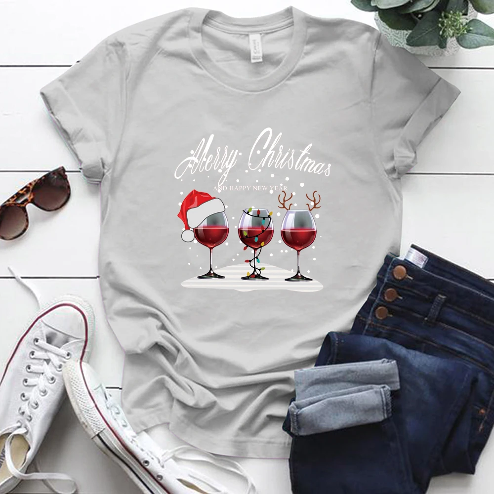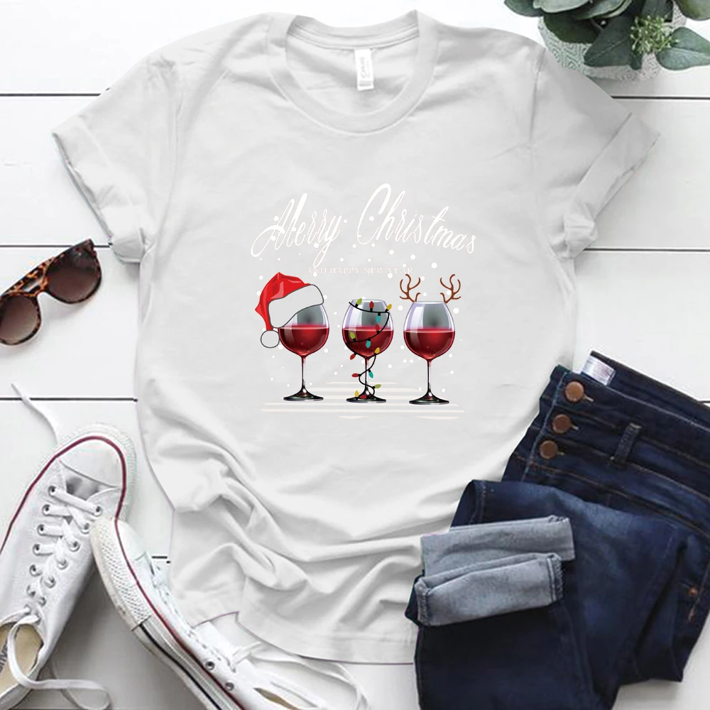 Рождественская Эстетическая Футболка с принтом вина, женская футболка большого размера с круглым вырезом, повседневный Рождественский подарок для дам, топы с вырезом