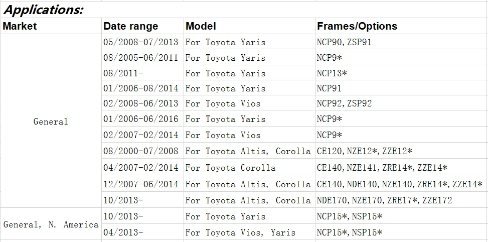 12/2007-06/2014 Toyota Altis, Corolla CE140, NDE140,NZE140, ZRE14 *, ZZE14 *