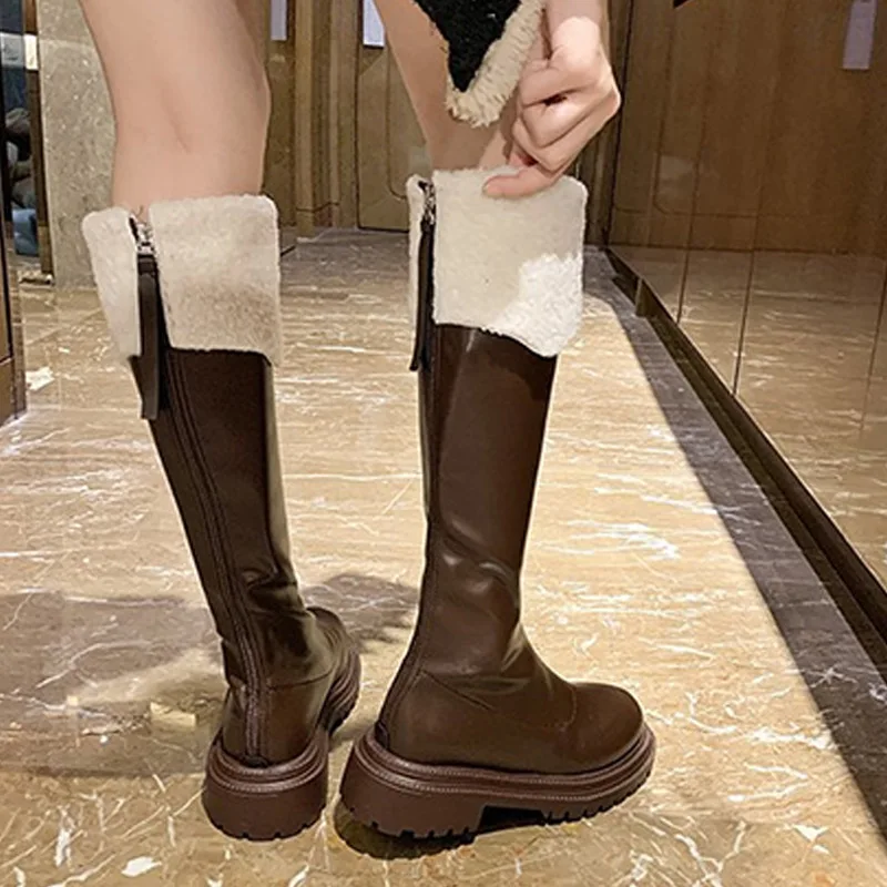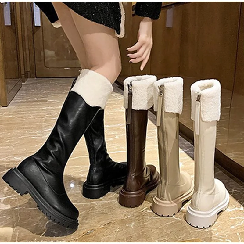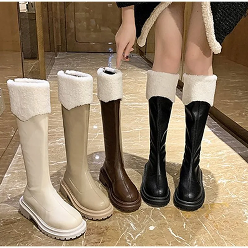 Зимние Сапоги До Колена Для Женщин, обувь из искусственной кожи, модные плюшевые теплые женские длинные сапоги, женская обувь на толстой платформе, новинка 2021