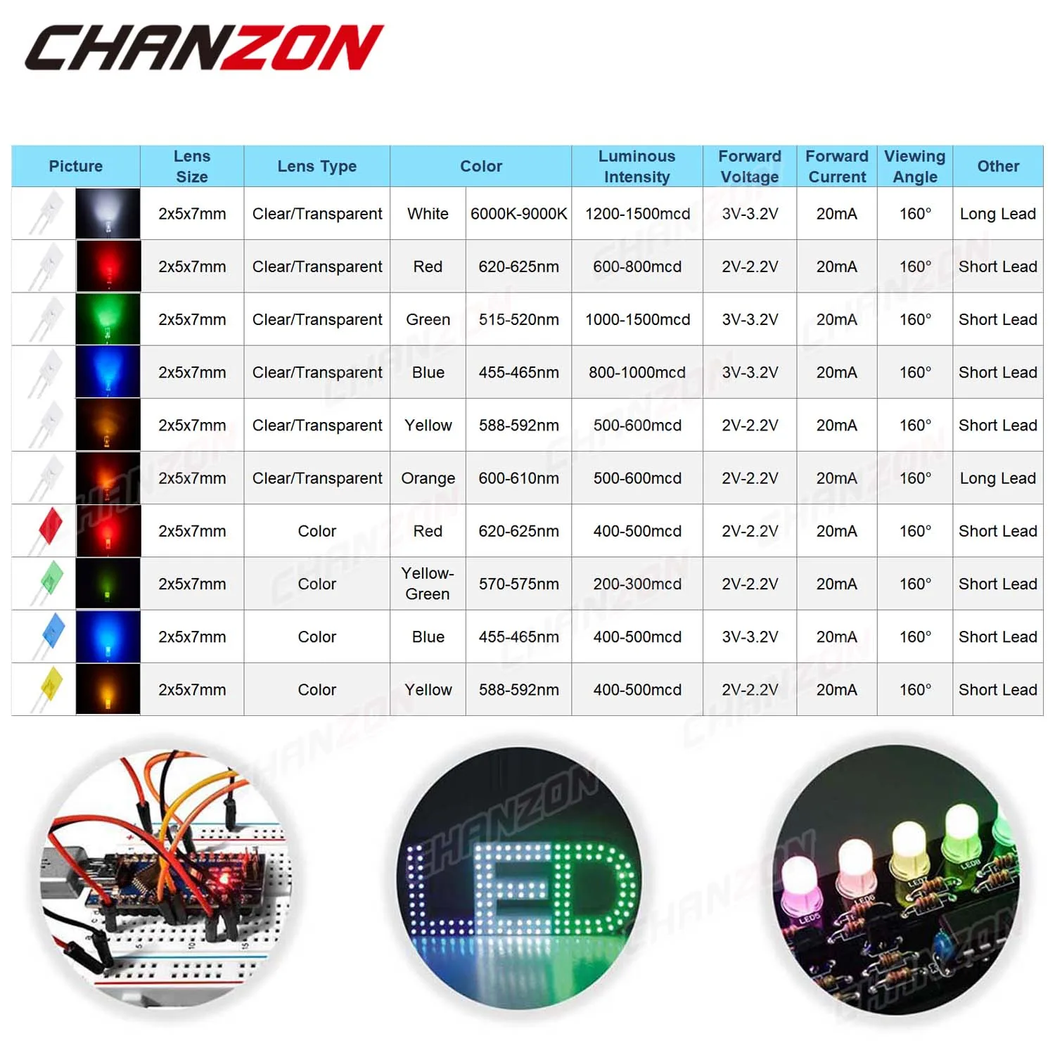 100 шт., квадратные светодиодные диоды 2x5x7 мм, белый, красный, зеленый, синий, желтый, оранжевый, 2x5x7 мм, прямоугольные, прозрачные, рассеянные, сделай сам, светоизлучающие лампы