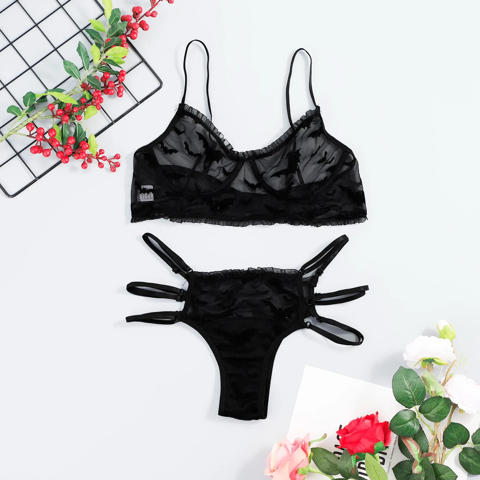 Женский сексуальный комплект нижнего белья без стального кольца из сетчатого флиса с вышитым рисунком летучей мыши, ночная рубашка на подтяжках, комплект из 2 предметов