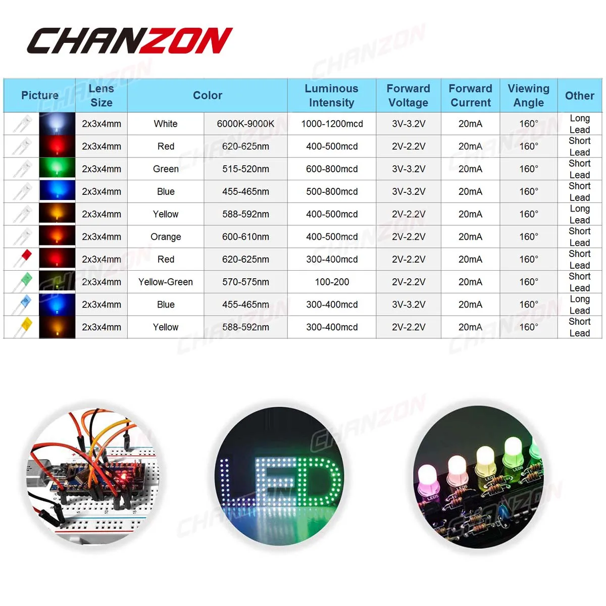 Бренд: CHANZON Количество: 100 шт./упак. Размер объектива: диаметр 2x3x 4 ммЛинзы: прозрачные линзы/цветные линзыЦвет излучения: белый/красный/зеленый/синий/желтый/оранжевый Угол обзора: 160 градусов Вперед Напряжение: 2,0-2,2 V (красный/желтый/оранжевый) | 3V-3,2 V (белый/зеленый/синий)Ток: 20 мАПолярность: анод (более длинная часть) | Катод (более короткая часть)