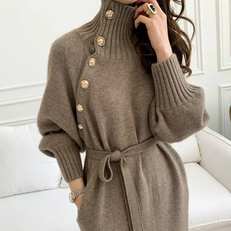 Трикотажное платье-свитер с высоким воротником, на пуговицах