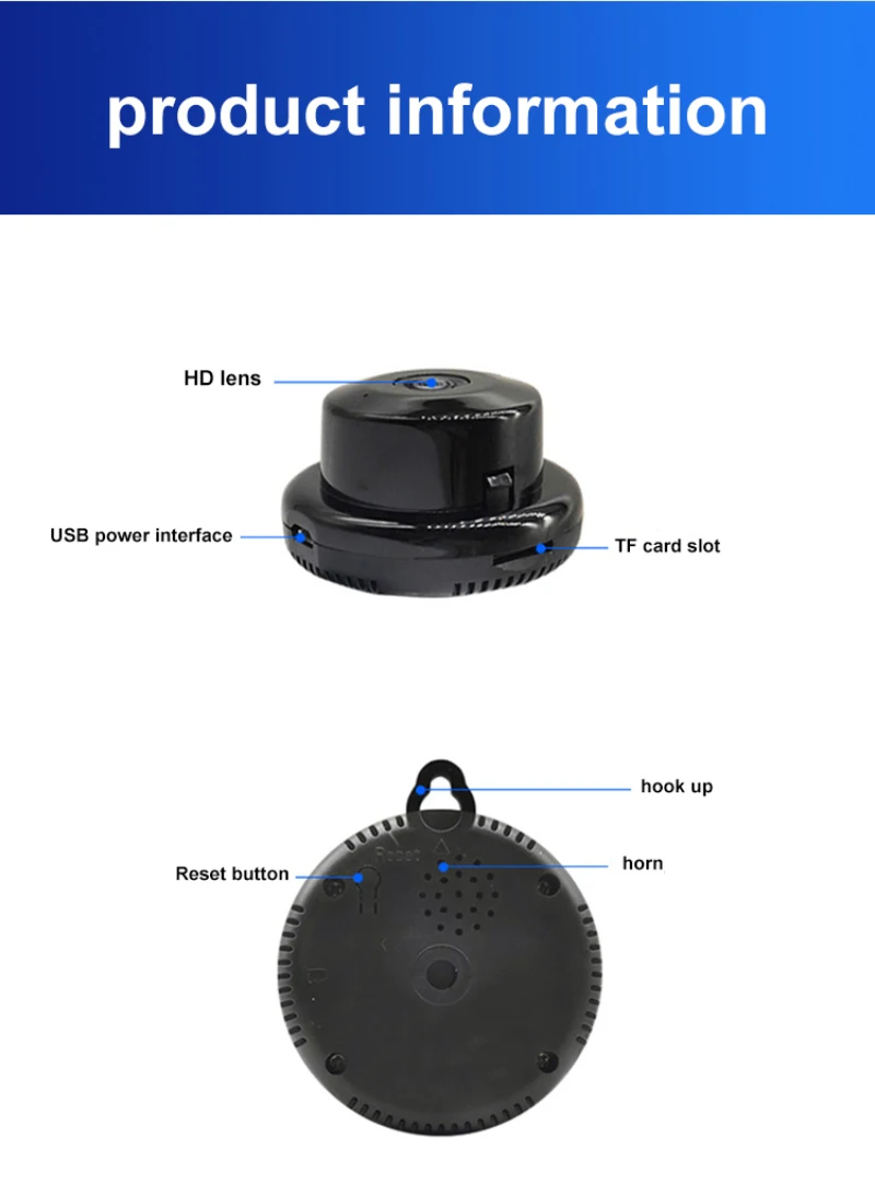 Камера может работать по Wi-Fi (2,4 ГГц Wi-Fi только) Wi-Fi или без. Когда он работает без Wi-Fi, пожалуйста, вставьте tf-карту (tf-карта не входит в комплект) и включите, камера будет записывать и сохранять видео файлы на sd-карту (sd-карта не входит в комплект)