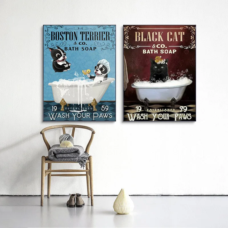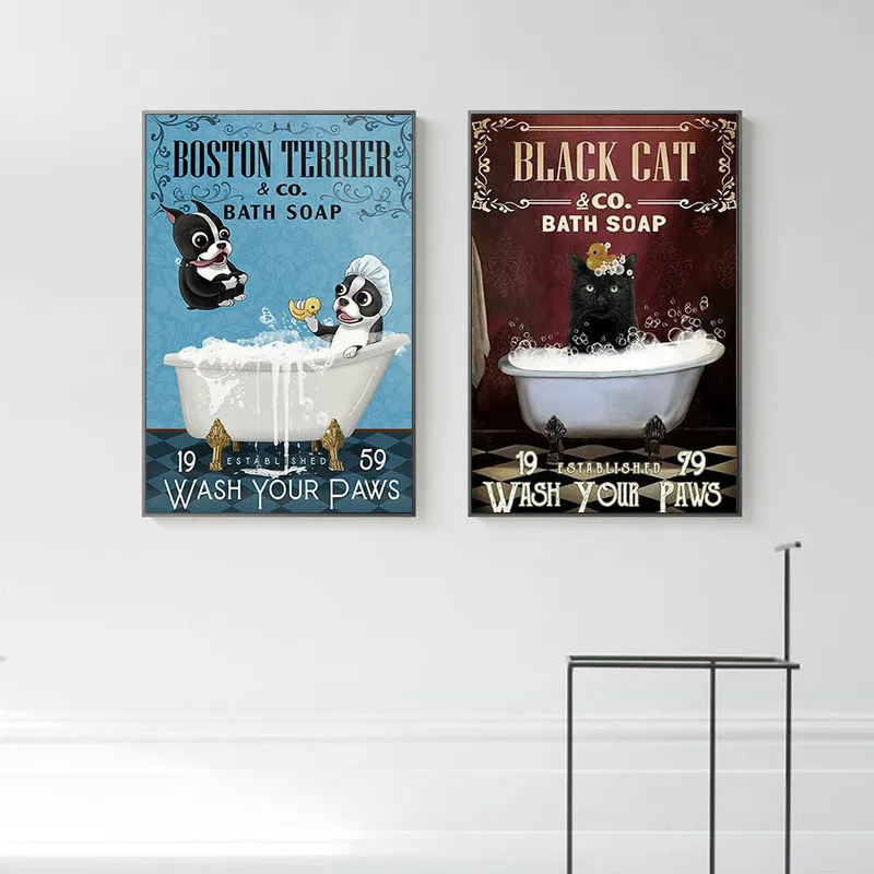Настенная Картина на холсте унитаза, Черный кот, Бостон-терьер, Постер, картины для ванной комнаты, настенное украшение, домашний декор