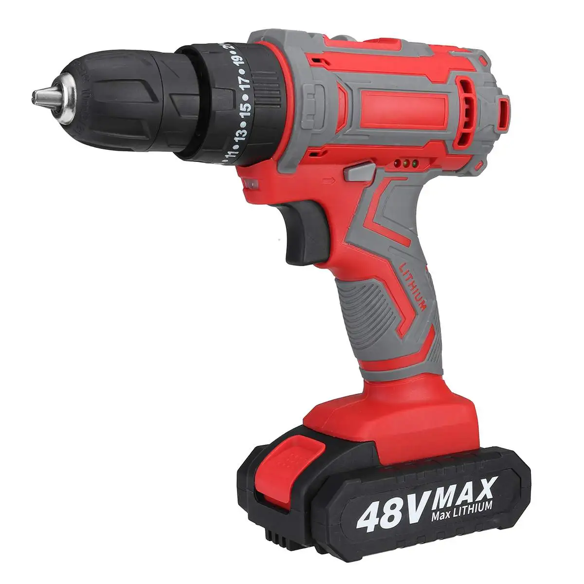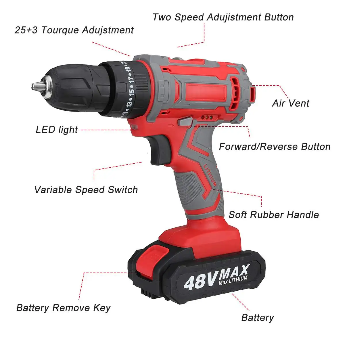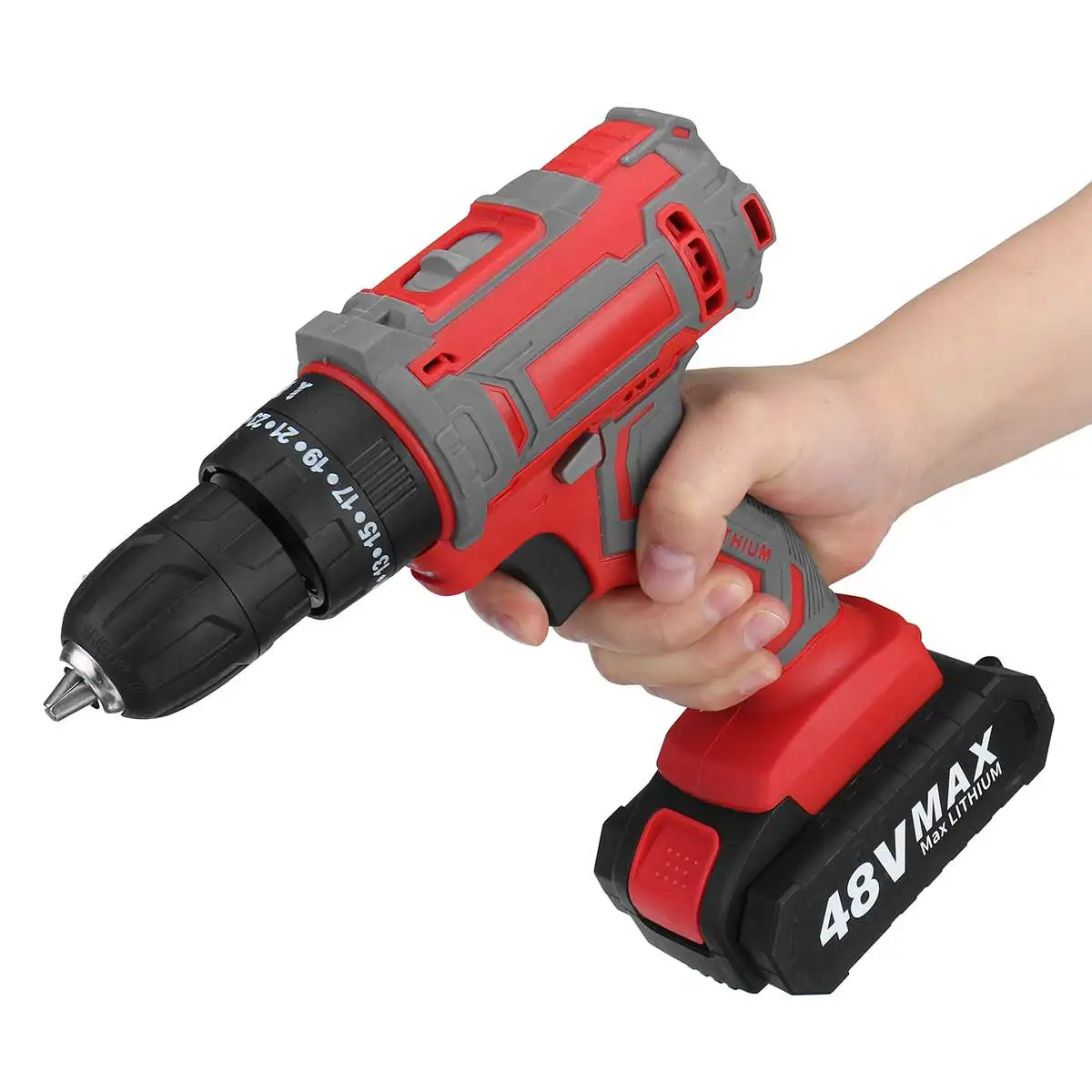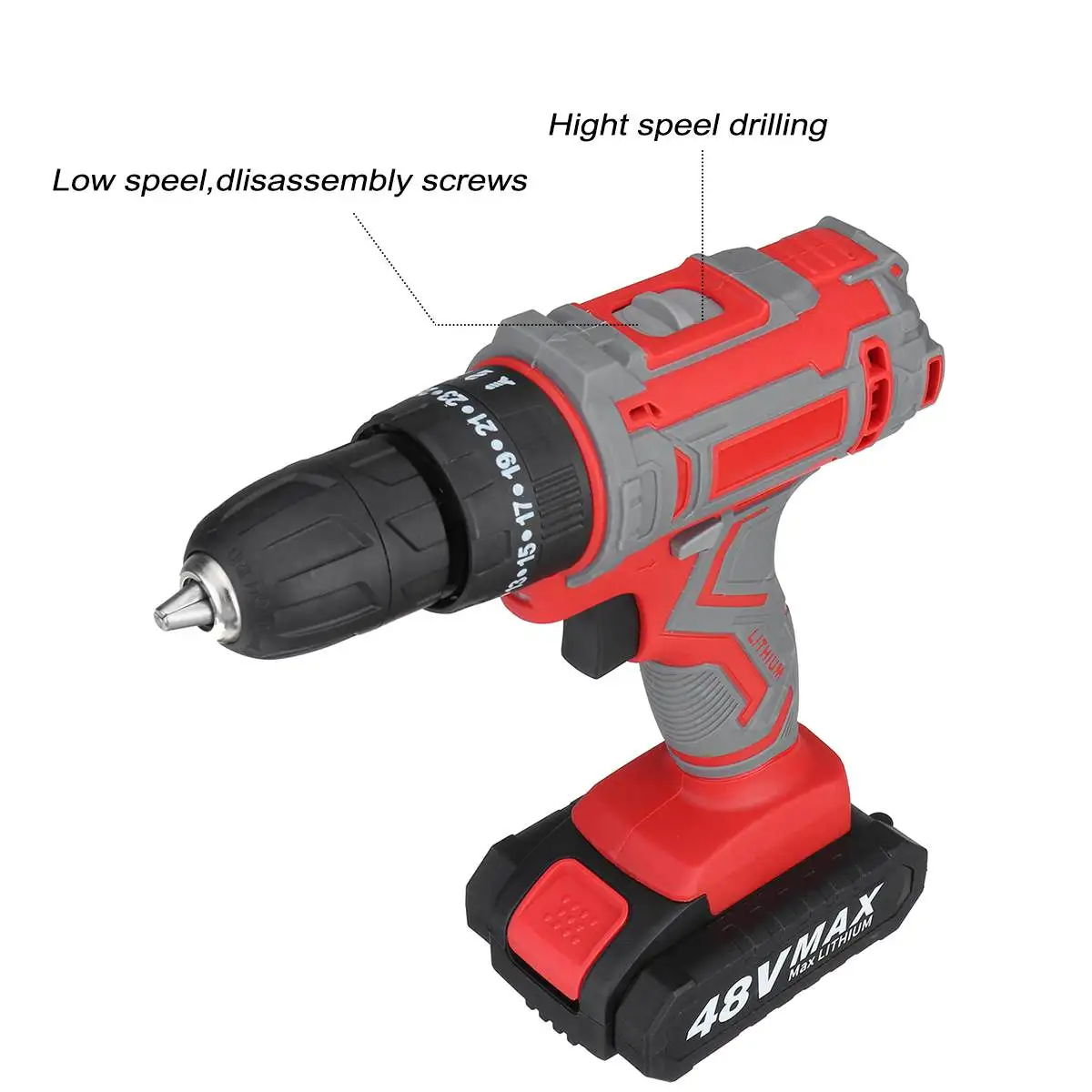 Электрическая отвертка 48 В, беспроводная дрель, плоский Ударный Молоток, 25 + 3 скорости, электроинструменты для деревообработки с 2 литий-ионными батареями