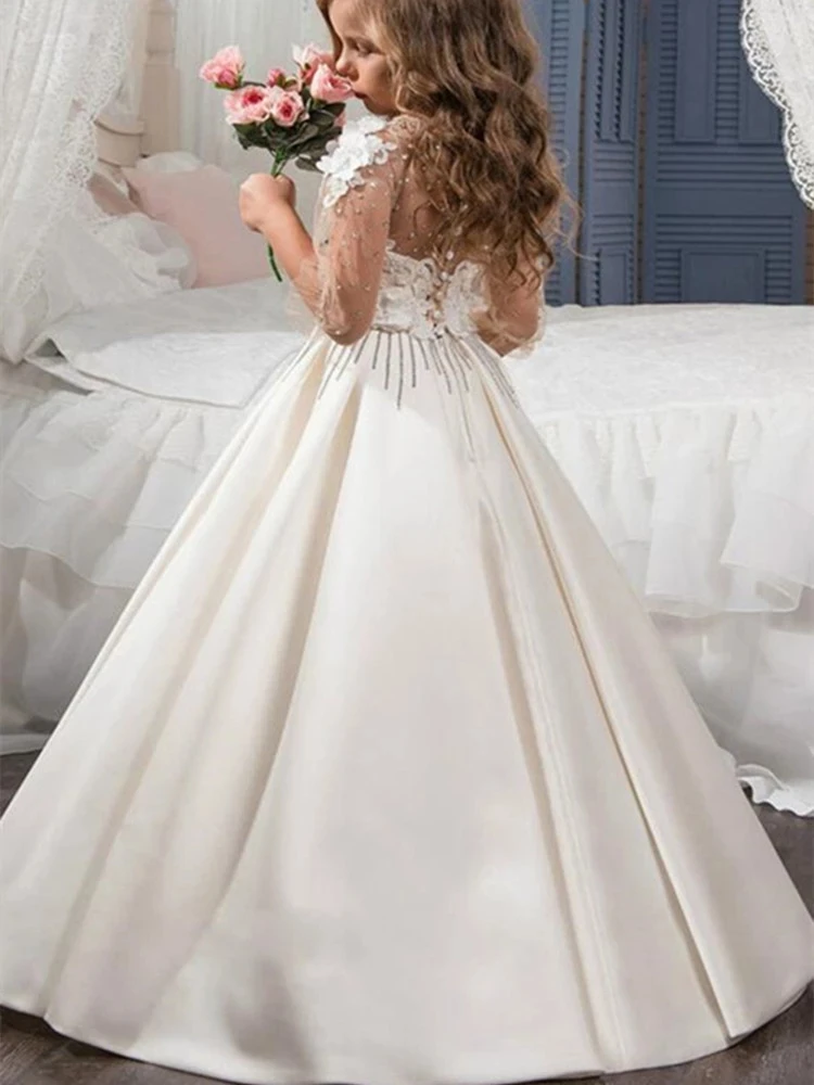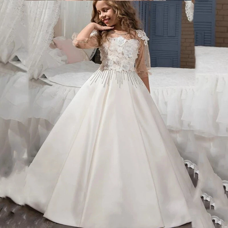 Платье принцессы для вечерние ринки, свадьбы, 2021, летнее стильное бальное платье в пол с круглым вырезом, рукавом до локтя и цветочным жемчугом для девочек