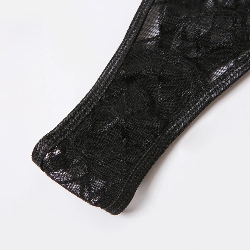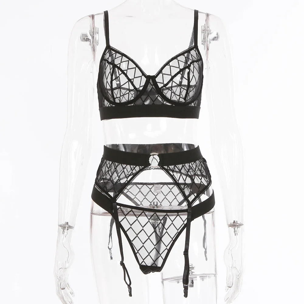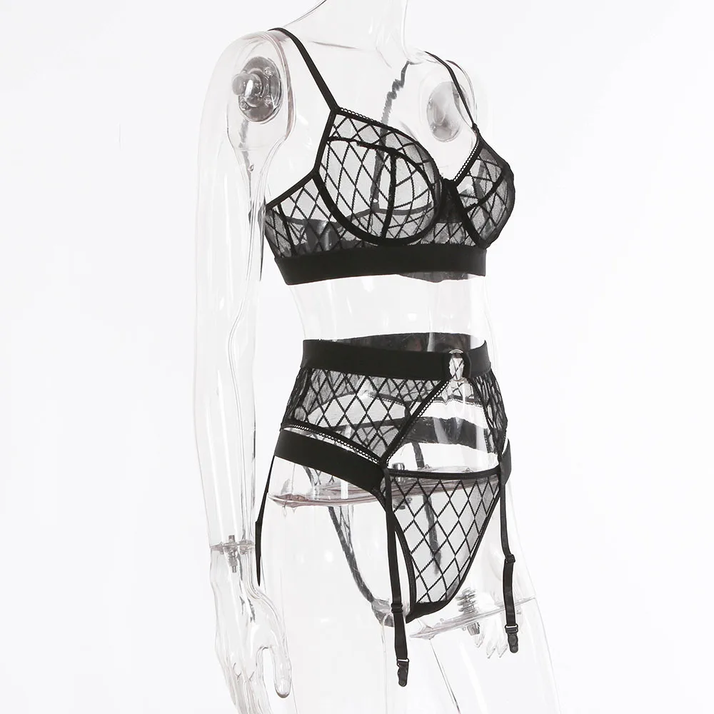 Комплект женского кружевного нижнего белья Yimunancy, комплект из 3 предметов в клетку, сетчатый комплект нижнего белья в стиле пэчворк, женский черный сексуальный комплект нижнего белья с косточками