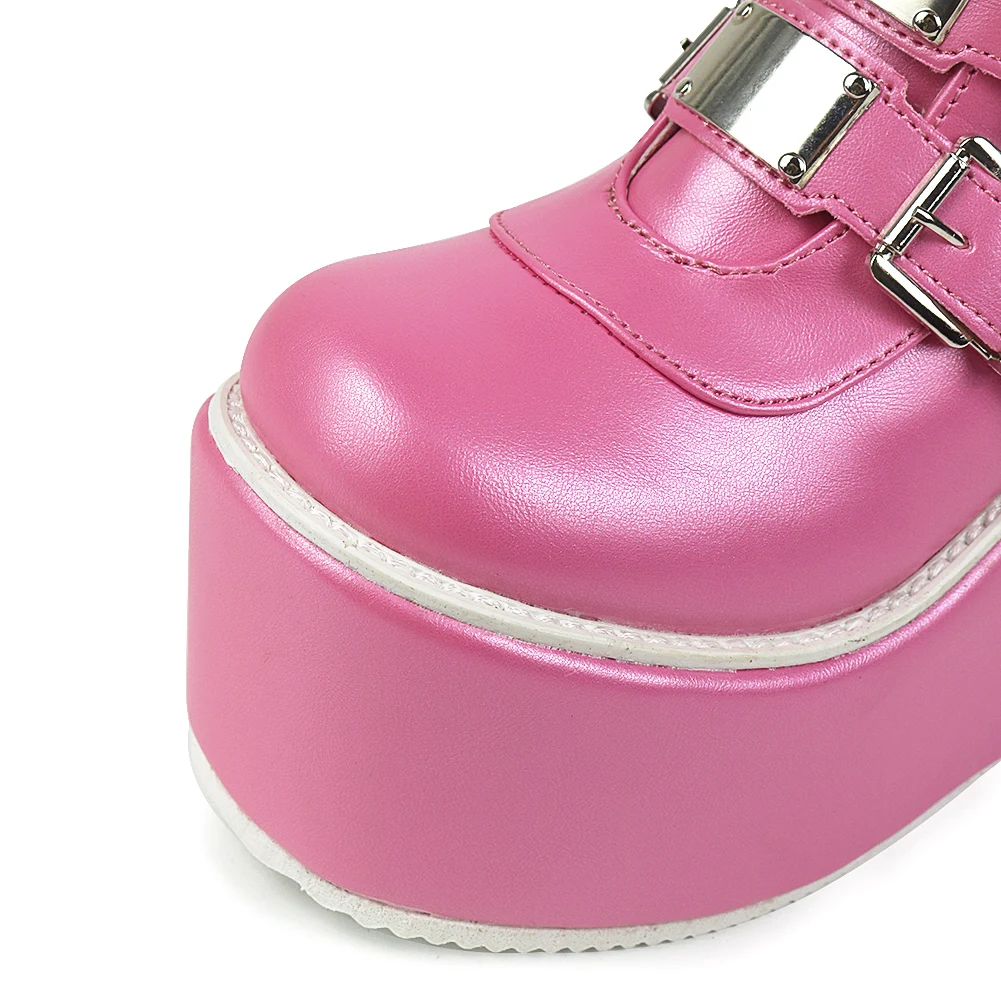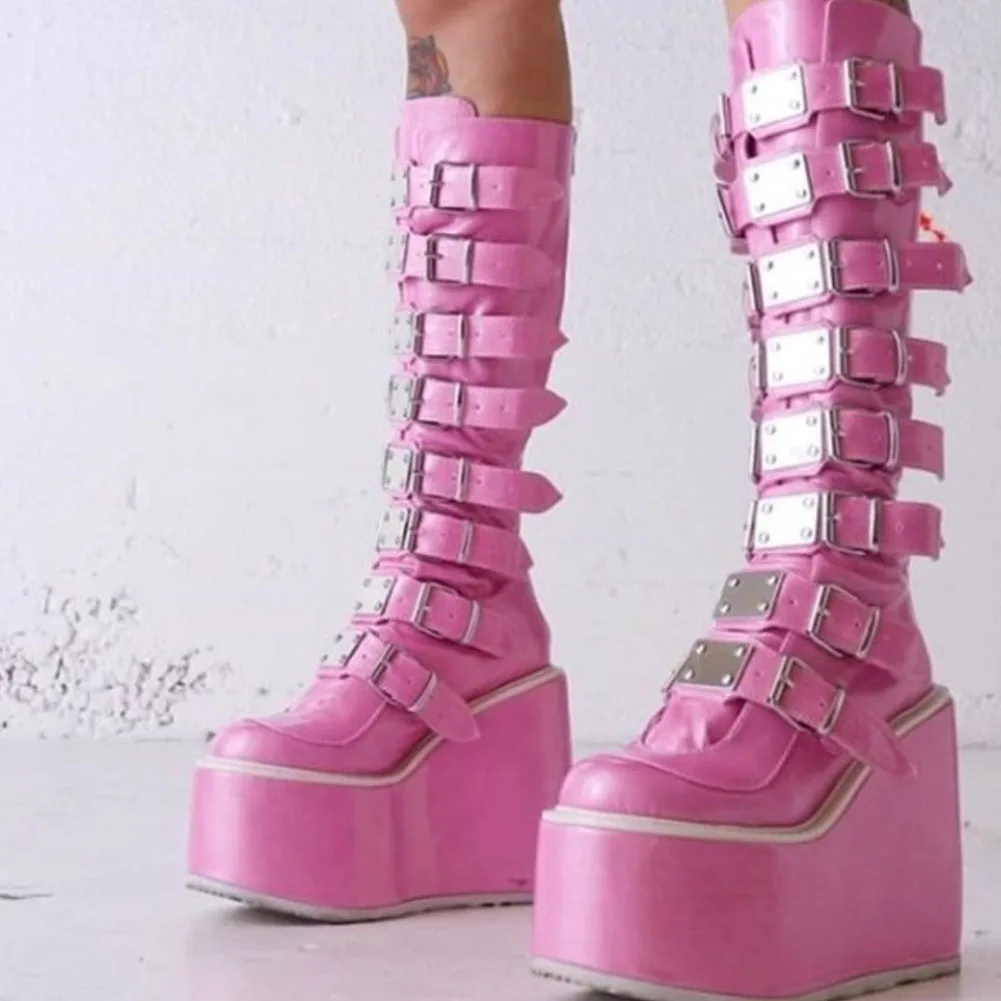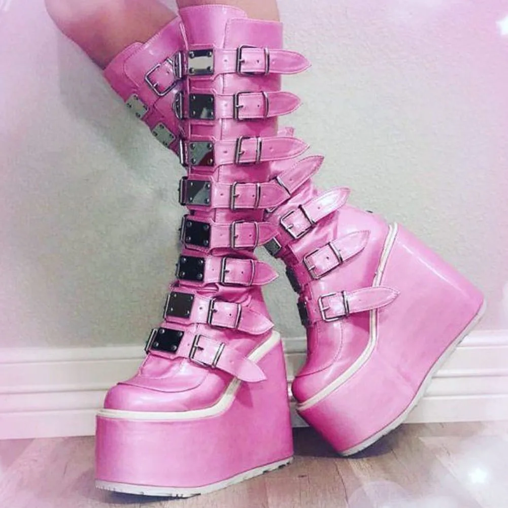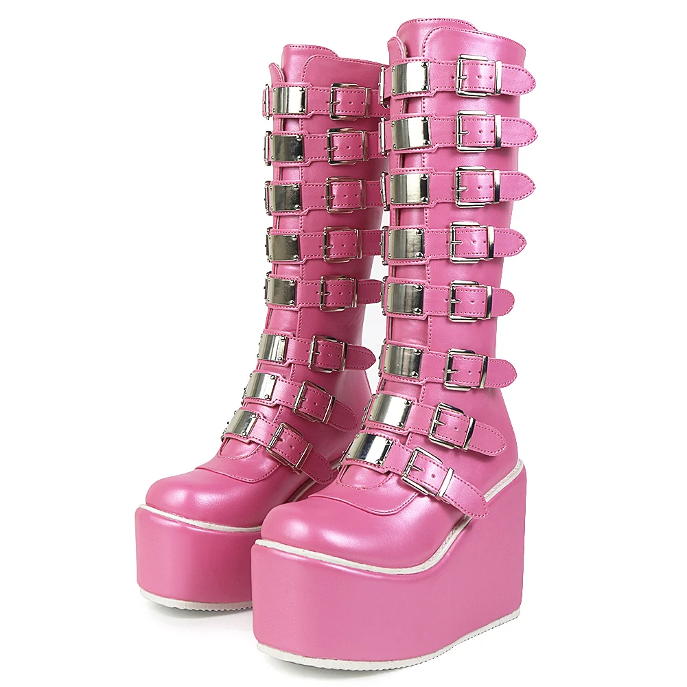 Женские сапоги, Осенние, розовые, готические, на танкетке, с металл...