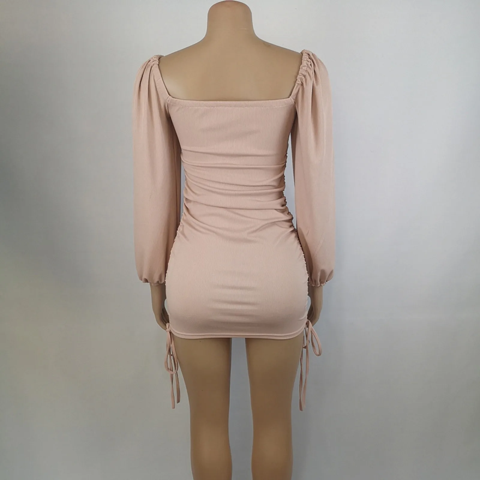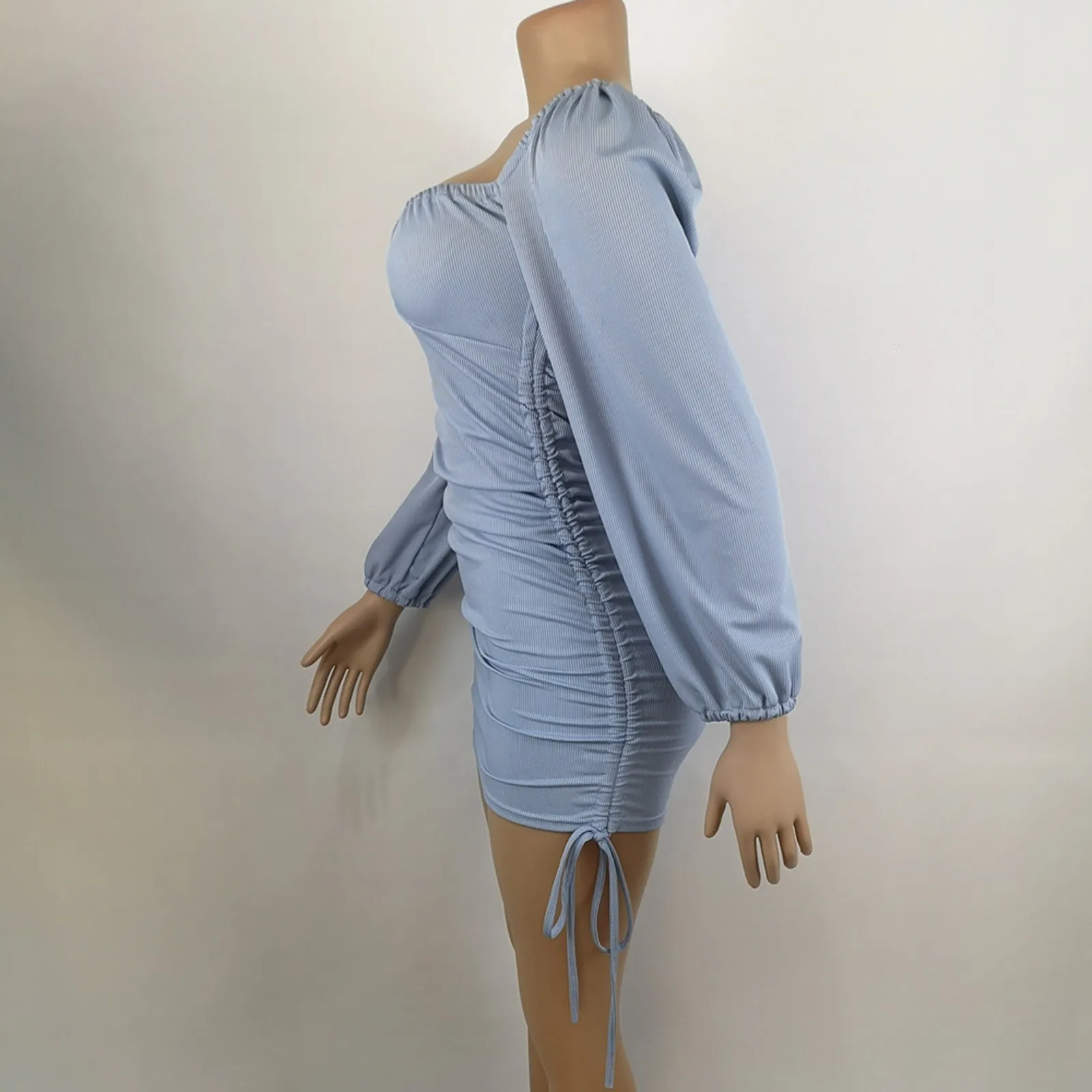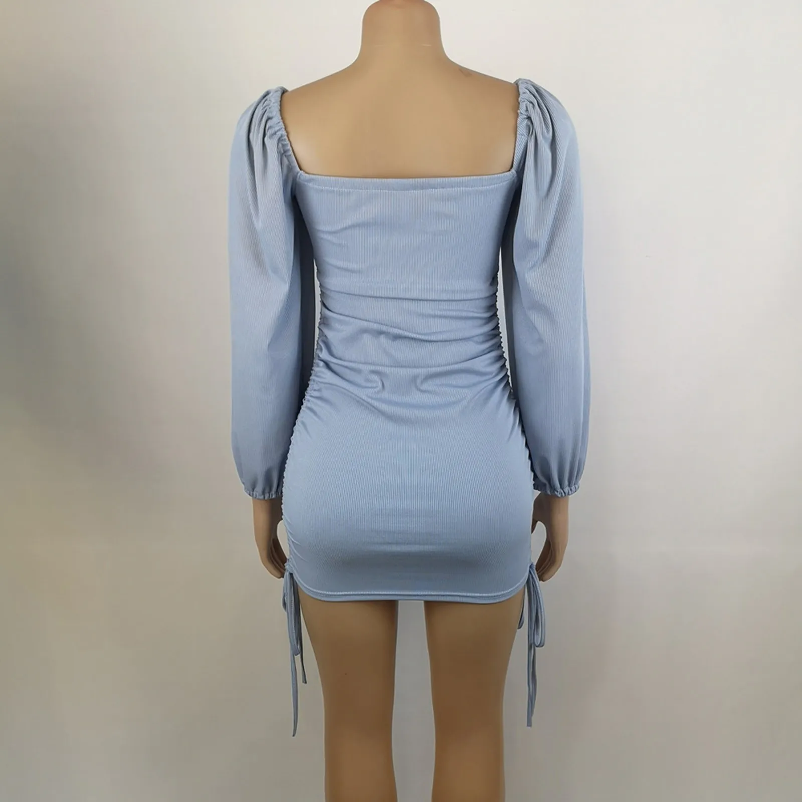 Особенности:Застежка на шнурке,Пышное Платье с длинными рукавами, низким квадратным вырезом, выше колена, со сборками по бокам, короткое платье с высокой талией, клубное мини-платье с рюшами спереди